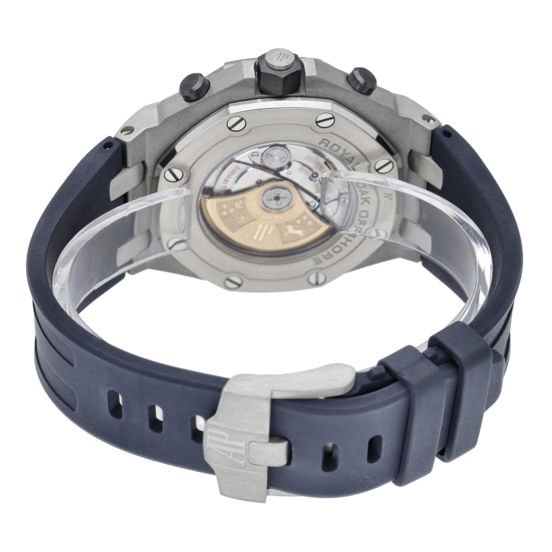 Powered by the Audemars Piguet Calibre 3126/3840 automatic movement, this reference offers dependable chronograph functionality and strong precision, visible through its solid case construction built for performance. The pushers and crown guards enhance durability, while the integrated rubber strap ensures secure, comfortable wrist wear.