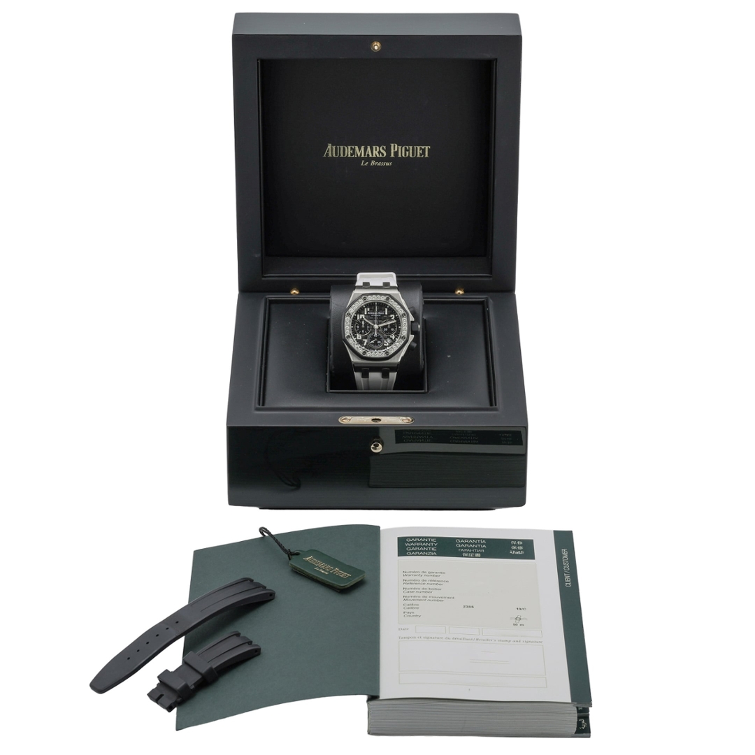 Powered by the Audemars Piguet Calibre 3126/3840 automatic chronograph movement, this model delivers reliable performance with a power reserve of approximately 50 hours. The calibre combines precision timekeeping with the durability expected from the Royal Oak Offshore line, making it equally suited to daily wear or special occasions.