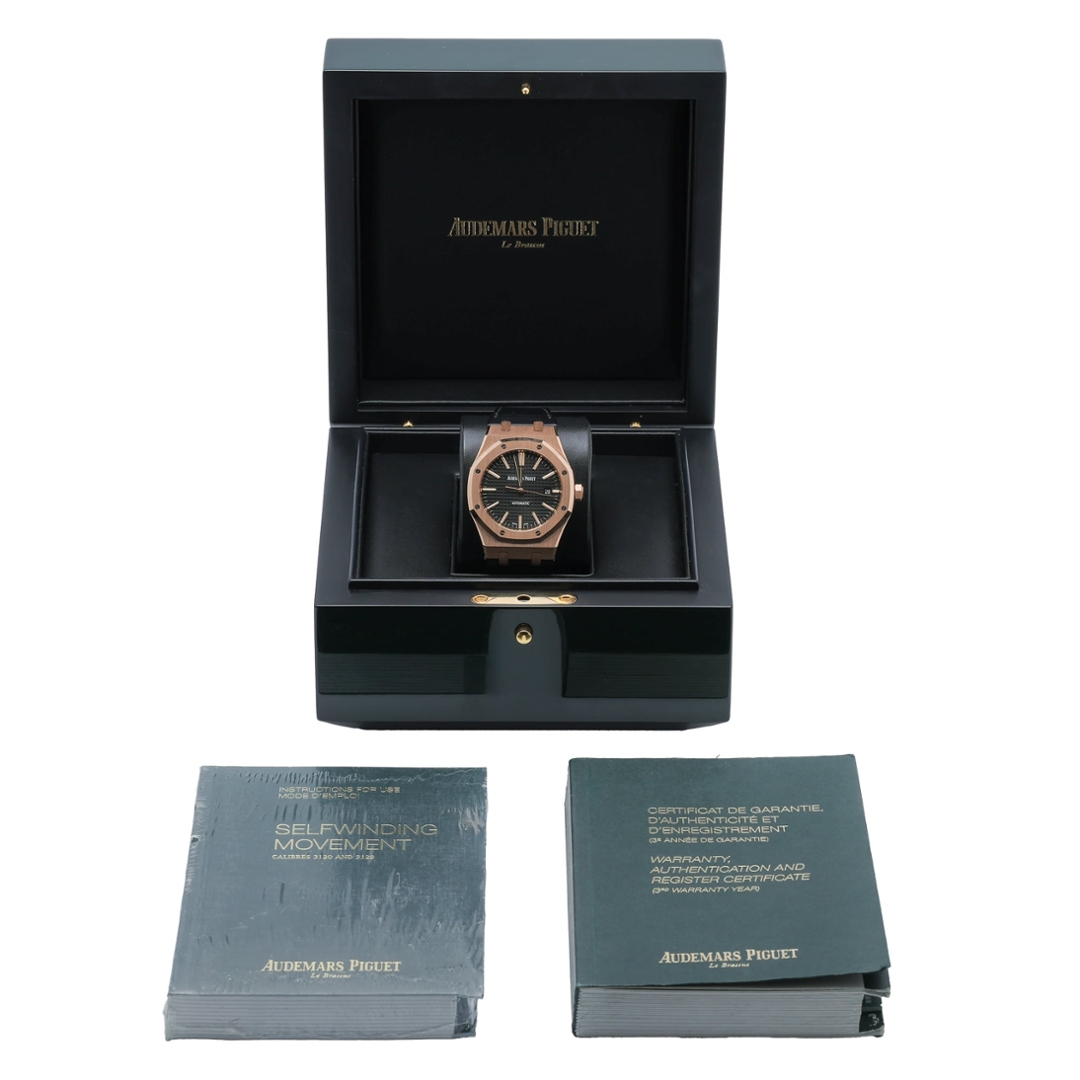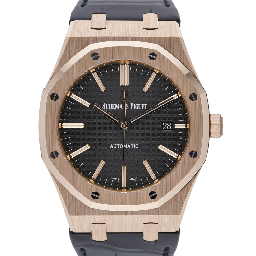 An Audemars Piguet Royal Oak Selfwinding is a highly desirable 41mm reference crafted in solid 18ct rose gold, paired with a black leather strap for a more understated and contemporary presentation. The iconic octagonal bezel with exposed screws frames the signature black “Grande Tapisserie” dial, finished with applied rose gold baton hour markers and matching hands, delivering strong contrast and unmistakable Royal Oak character.