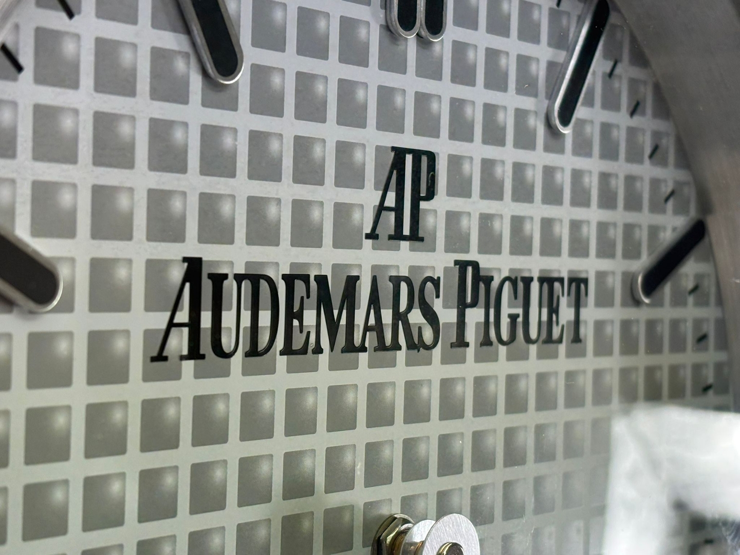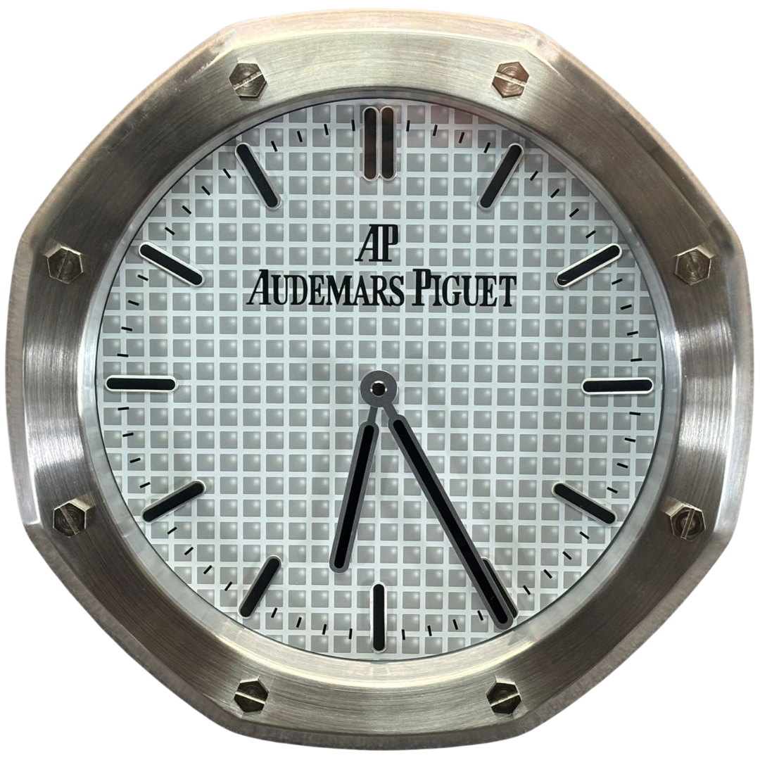 A stainless steel replica Audemars Piguet wall clock designed in the instantly recognisable Royal Oak style, this piece brings the prestige of high horology into a bold decorative format. The octagonal bezel, featuring exposed screw detailing, mirrors the iconic design codes of Audemars Piguet. The silver-toned case and refined white grid-pattern dial capture the luxurious appeal of the brand. The prominent AP logo and clean baton hour markers ensure the dial is instantly striking, making it a sophisticated statement for any wall.