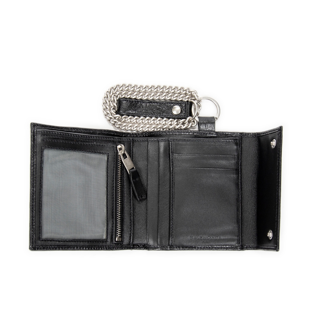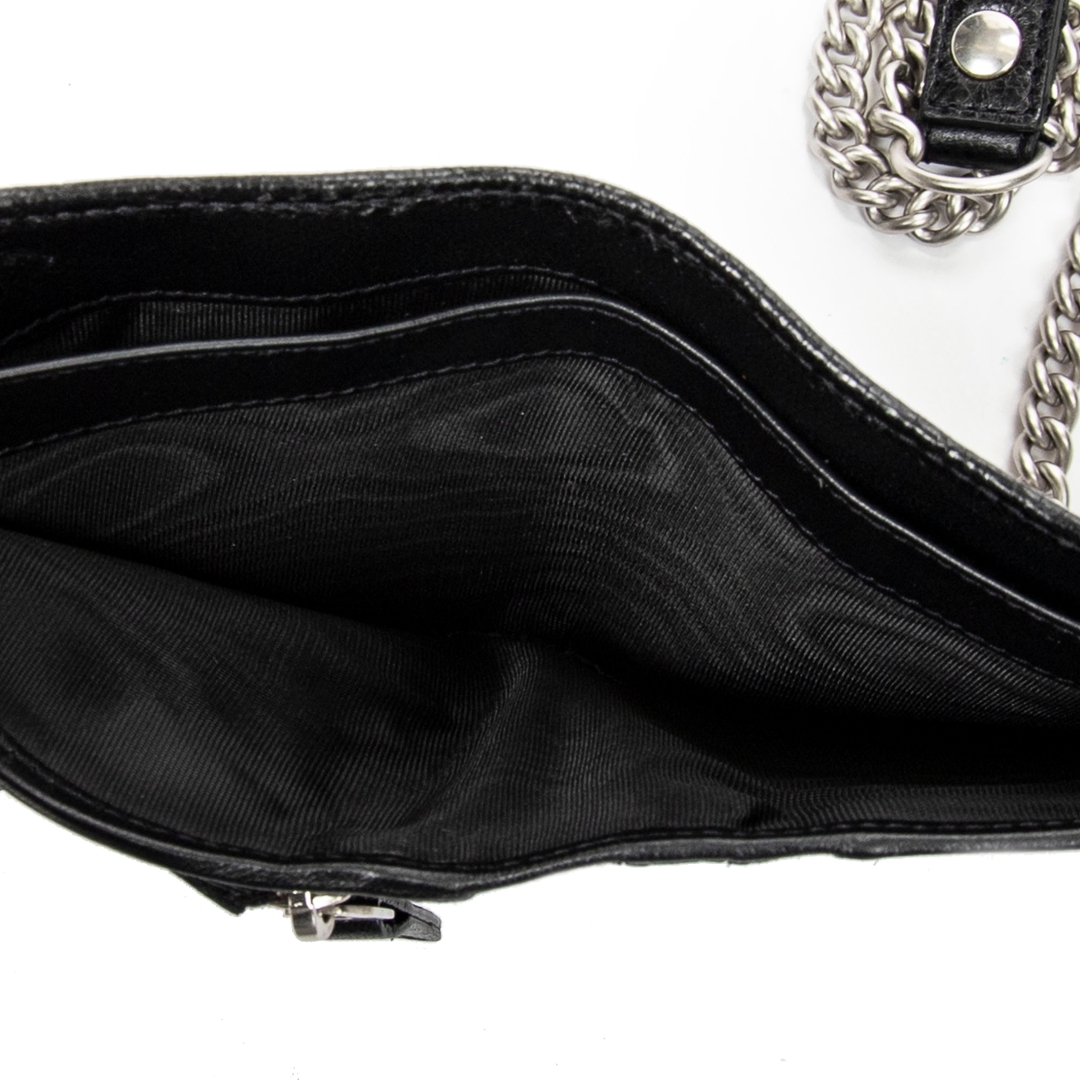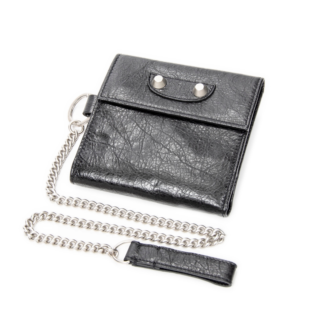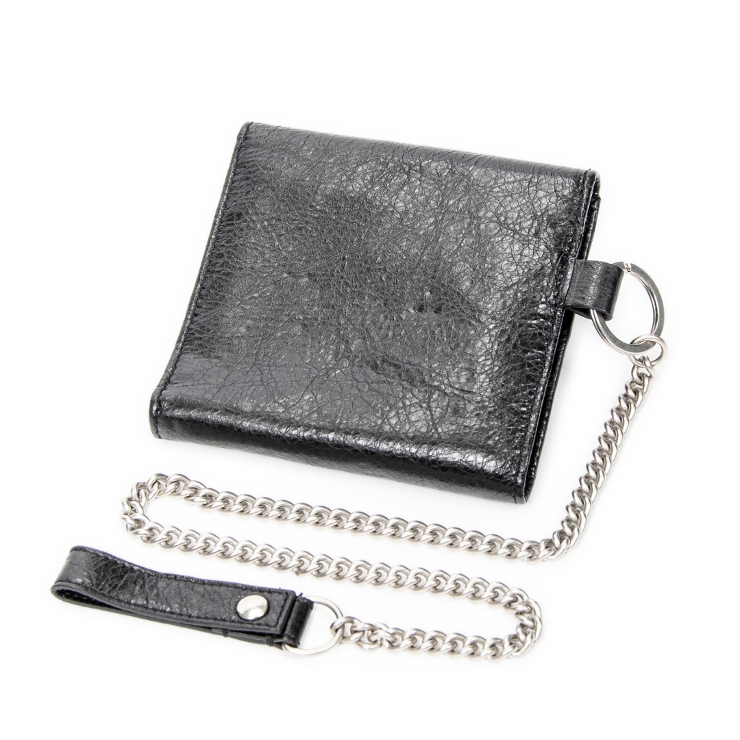 A vintage Balenciaga black calf leather Explorer Square Wallet for those who appreciate edgy design with practical function. Crafted from supple black calf leather with a textured finish, this piece reflects Balenciaga’s modern aesthetic, combining luxury craftsmanship with a bold, urban edge. The wallet is accented with silver-tone hardware and includes a detachable chain with a leather tab, enhancing both style and versatility.