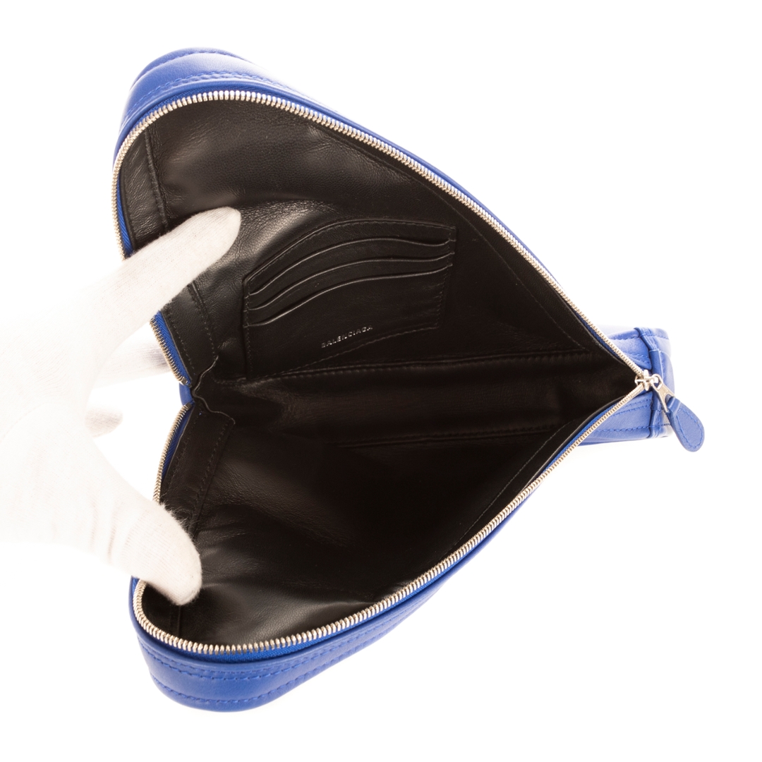 Compact and stylish, this pouch is perfectly proportioned for carrying essentials, with a zip closure ensuring belongings are kept secure. Its structured triangular form sets it apart from more traditional silhouettes, making it a true statement accessory. The smooth leather finish and sharp lines highlight Balenciaga’s innovative approach to fashion, while still offering everyday practicality.