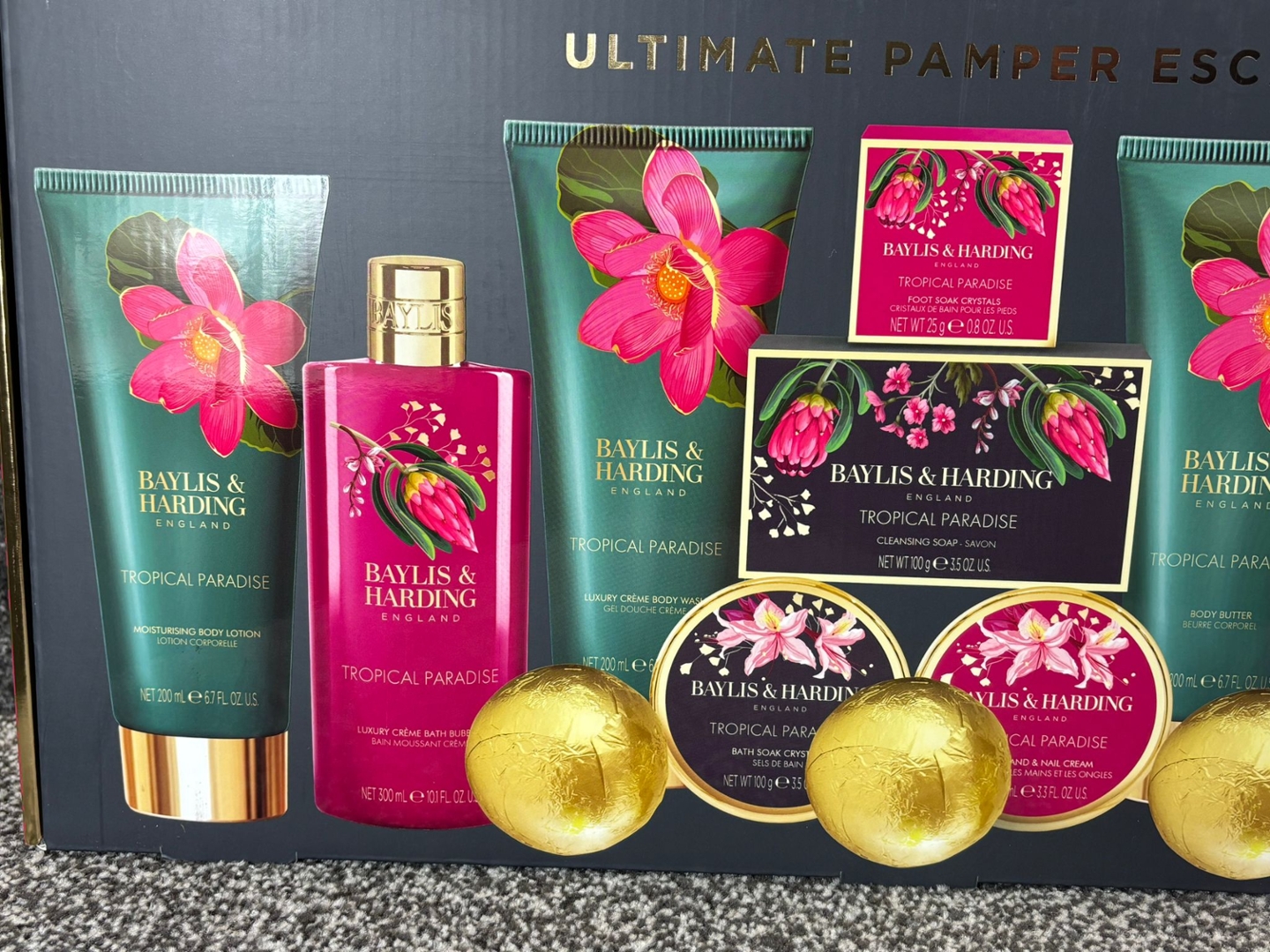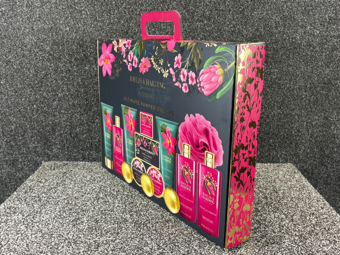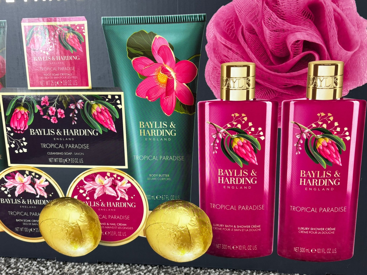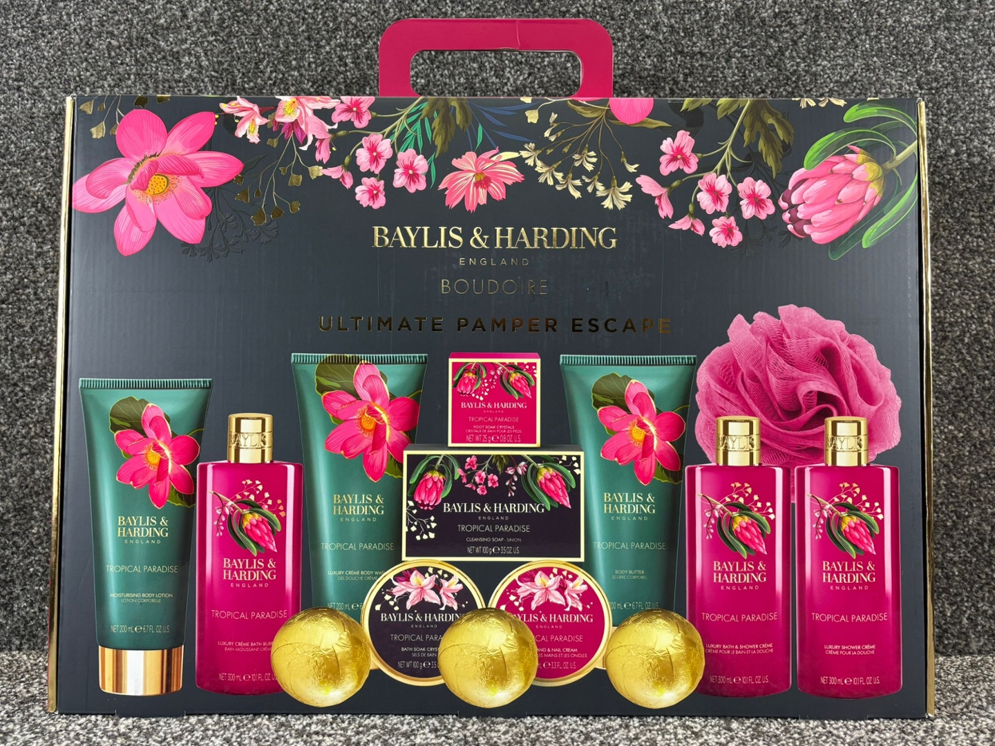 A Baylis & Harding Boudoire Ultimate Pamper Escape Set is the perfect indulgence for anyone who loves a touch of luxury in their self-care routine. Beautifully presented in a vibrant gift box with floral accents, this set is designed to bring a spa-like experience to the comfort of your home. The Tropical Paradise fragrance combines exotic fruity notes with warm floral tones, creating an uplifting and refreshing scent that lingers delicately on the skin.