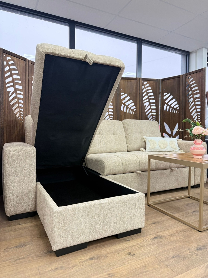 Integrated within the chaise is a lift-up storage compartment,