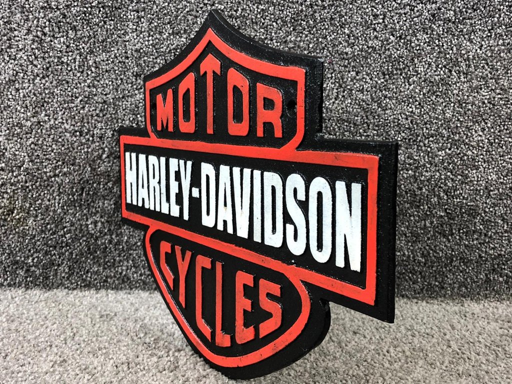 A black & white cast iron Harley Davidson wall plaque. Approx 10" height, 13" width.