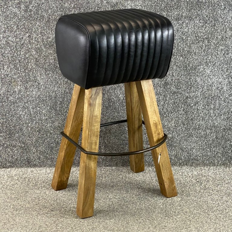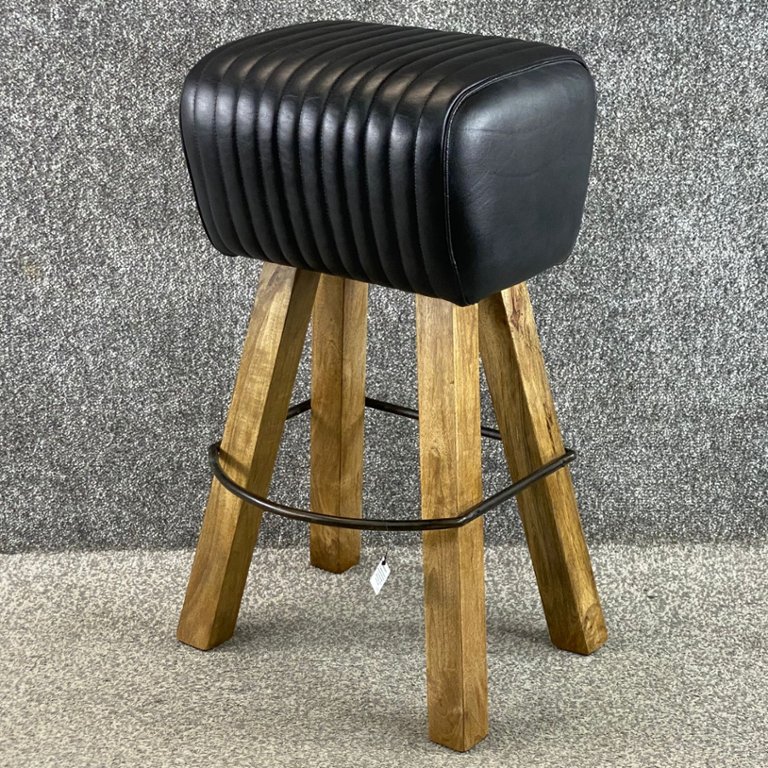 A black leather fan design bar stool on long wooden legs with a dark metal foot trim. Approx 29" height, 15" width, 13" depth.