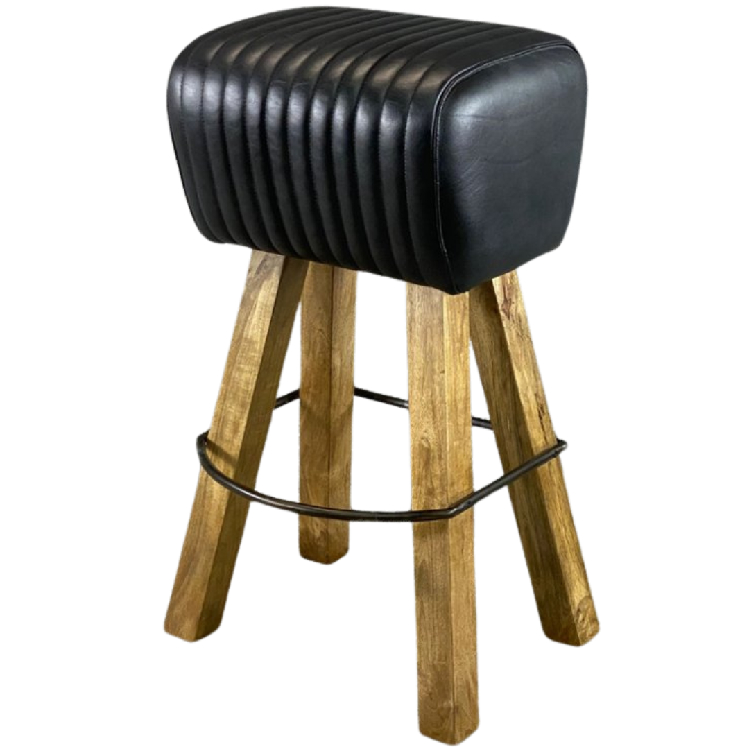 A Black Leather Fan Design Bar Stool on Long Wooden Legs with a Dark Metal Foot Trim. This eye-catching bar stool combines classic elegance with modern design elements, making it a standout piece for your home bar or kitchen counter.
