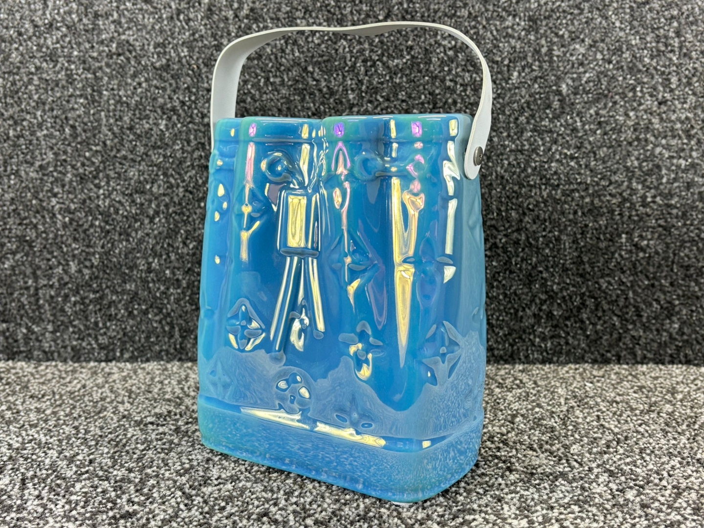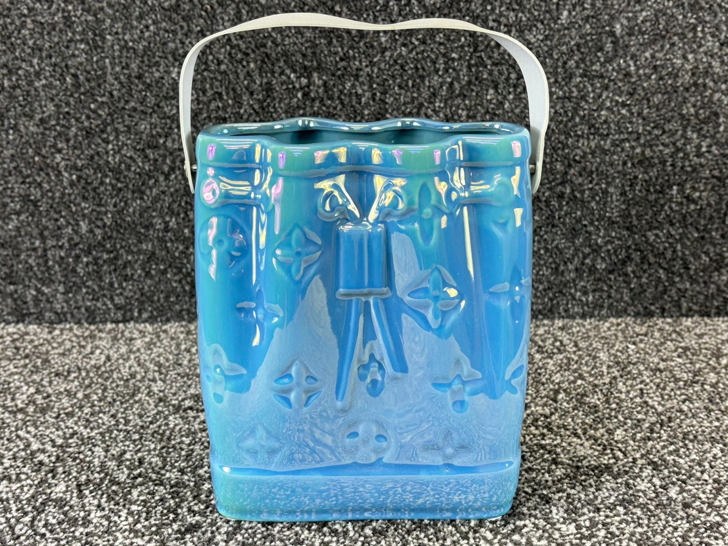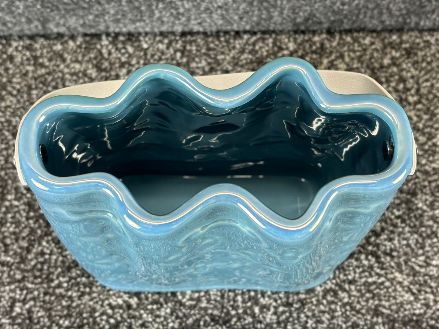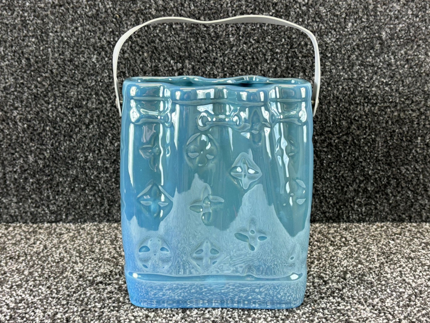 A Blue Ceramic Handbag Vase with a White Handle. Approx 20cm height, 15cm width, 8cm depth.