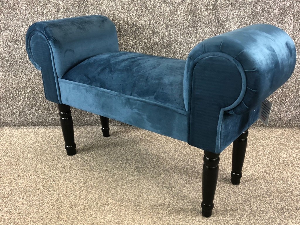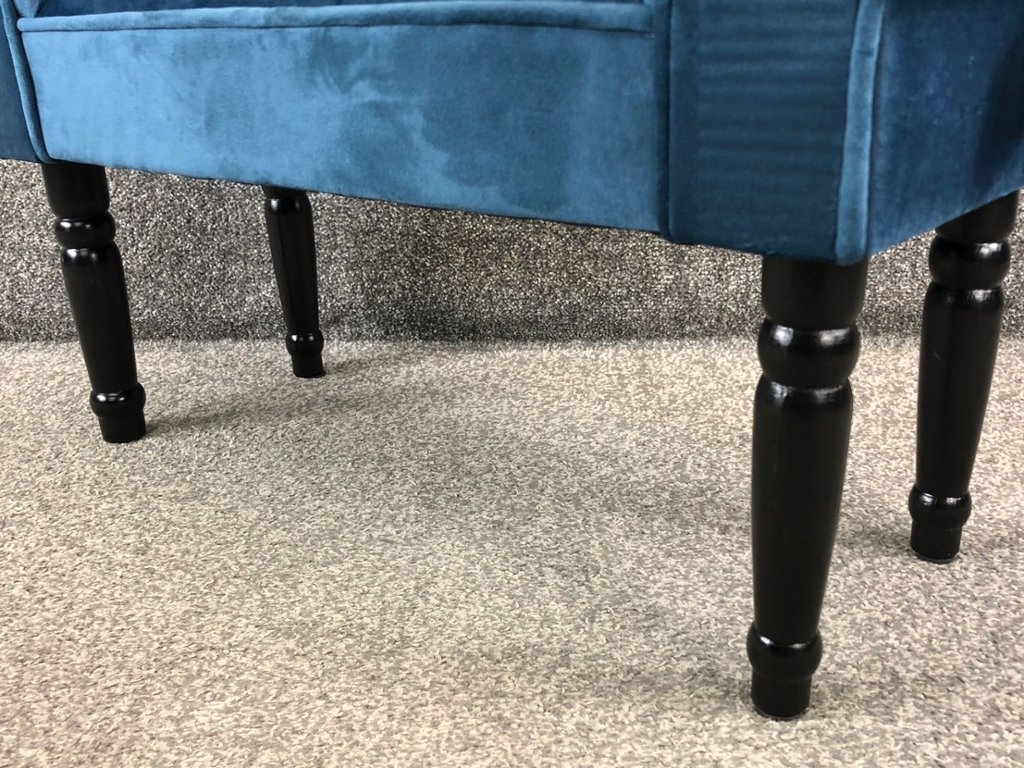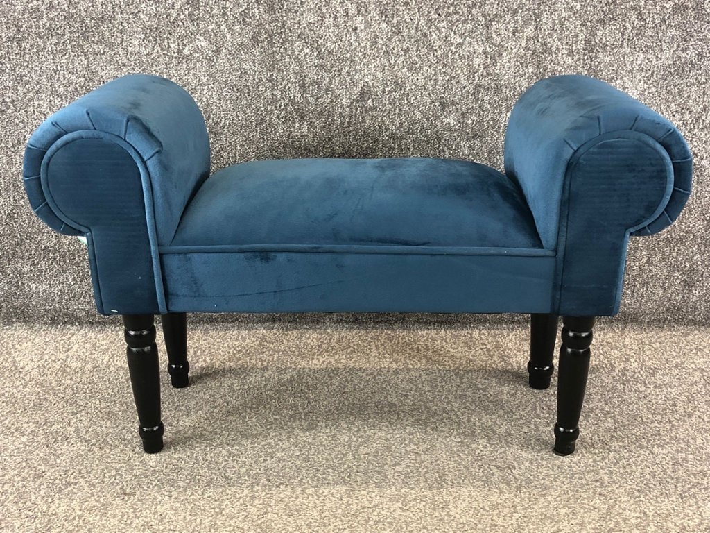 A blue french velvet double ended daybed design foot stool on black wooden legs. Approx 20" height, 33" width, 12" depth.
