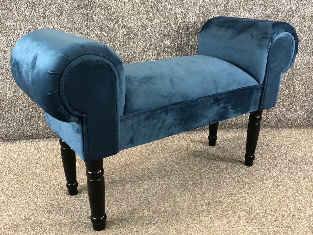 A blue French velvet double ended daybed design foot stool brings a rich sense of elegance and character to any interior. Upholstered in a deep blue velvet with a soft, tactile finish, it features classic rolled ends that create a refined and balanced silhouette inspired by traditional French furniture design.