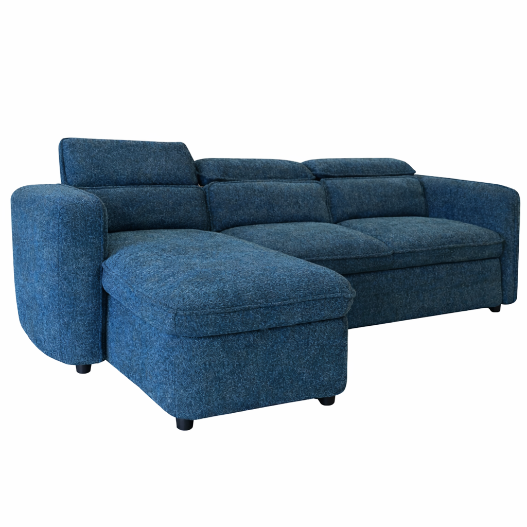 A blue Milan sofa bed makes a confident statement with its rich, textured upholstery and clean, contemporary silhouette. Set on discreet black legs, the design feels grounded yet modern, easily anchoring both open-plan living spaces and cosy interiors. The generous proportions create a welcoming focal point, while the structured back and wide chaise offer an inviting balance of comfort and visual presence.