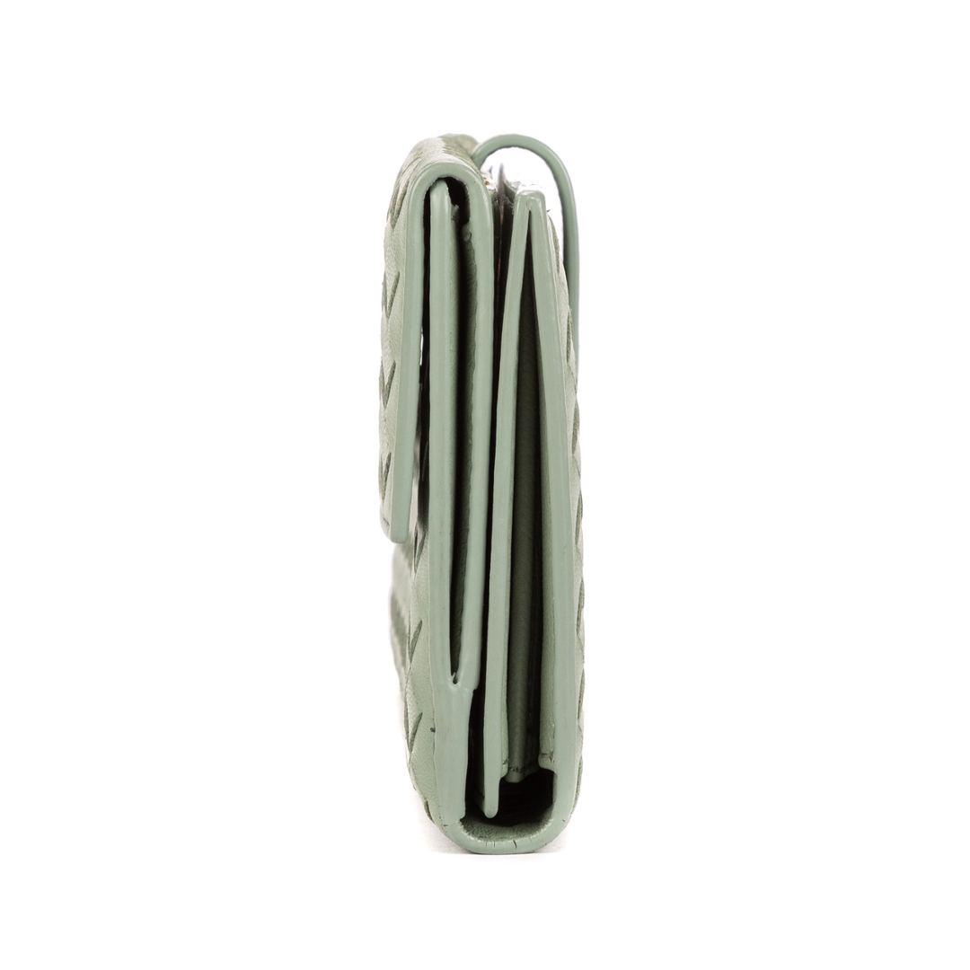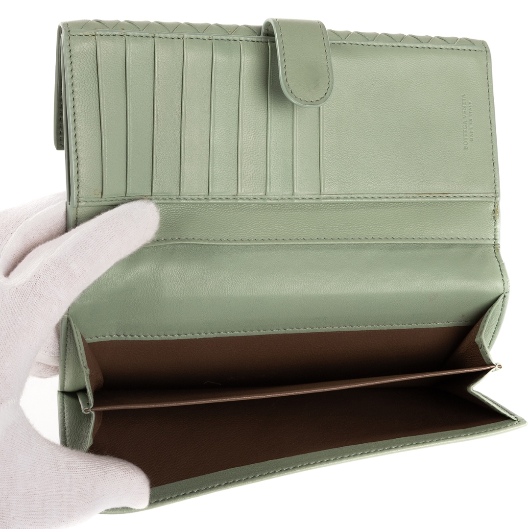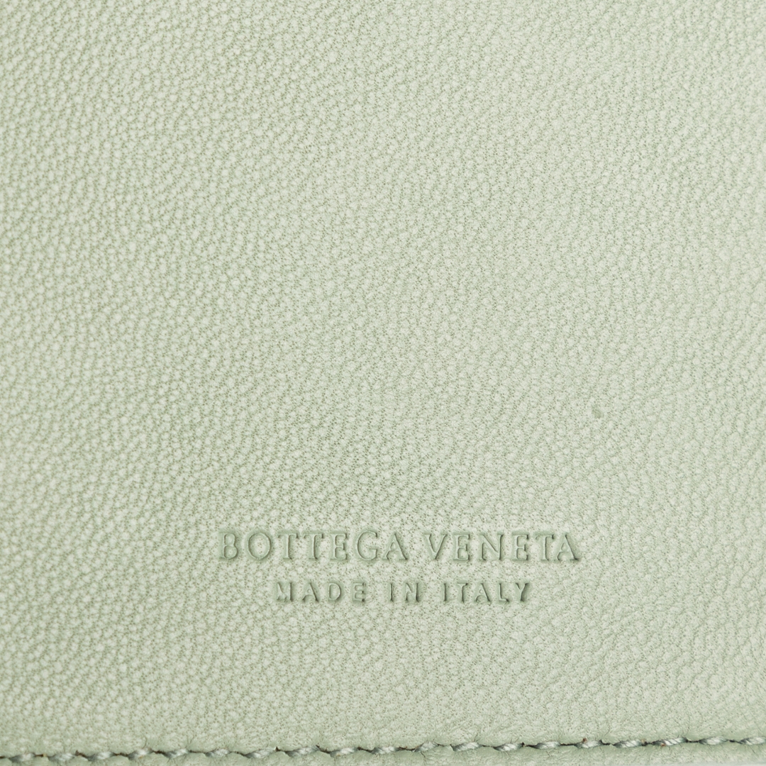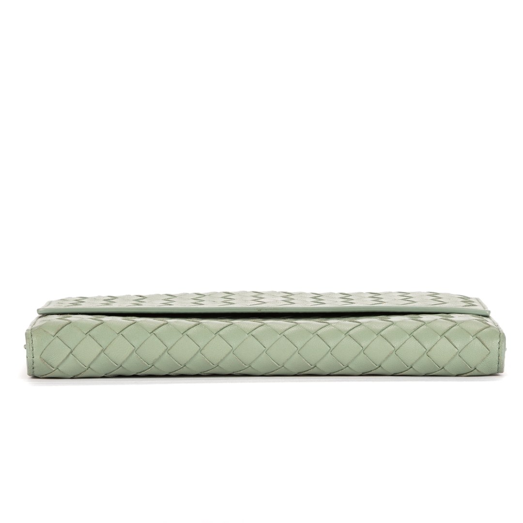 A vintage Bottega Veneta light green calf leather Intrecciato Long Wallet with a certificate of authenticity, Approximately 9cm height, 19cm width.