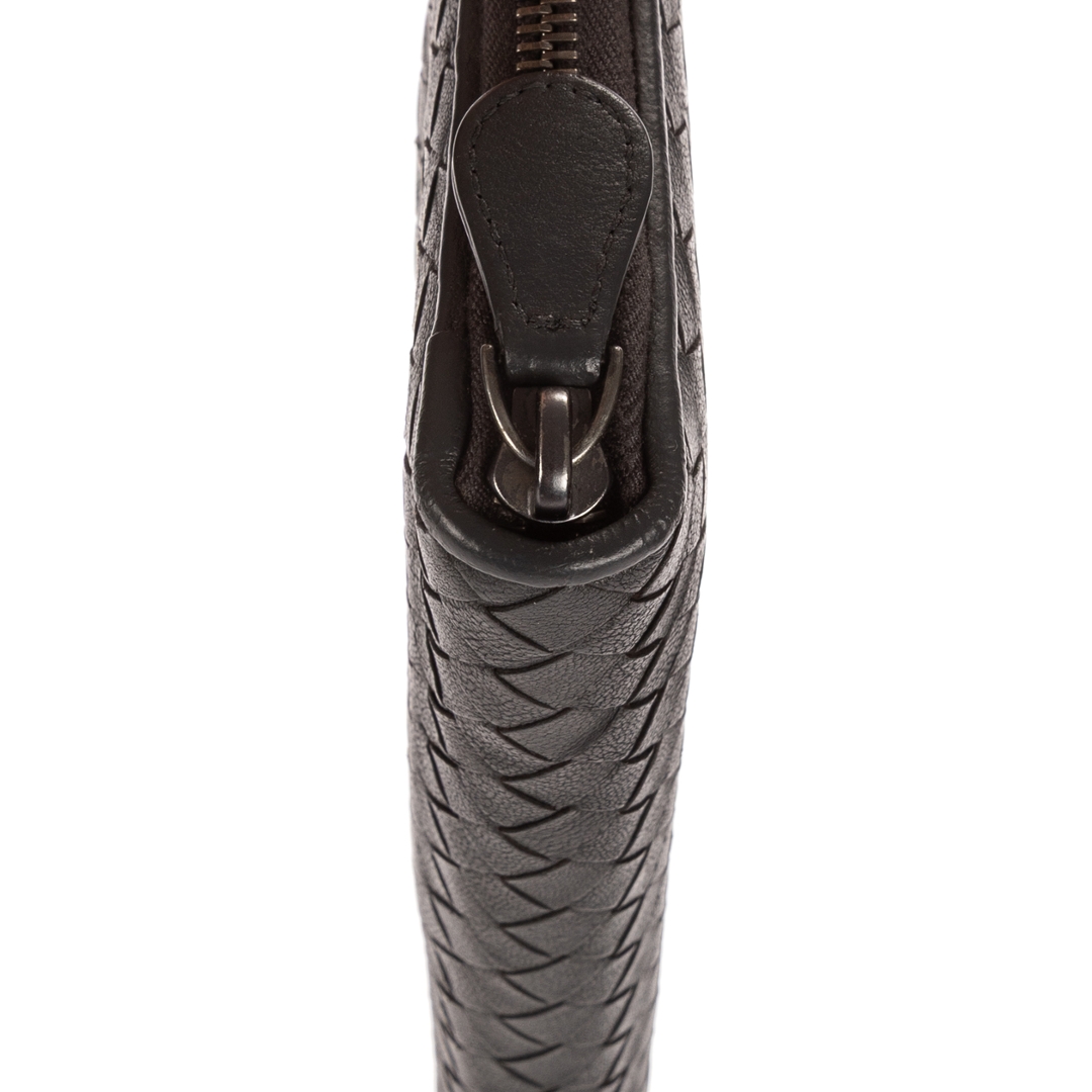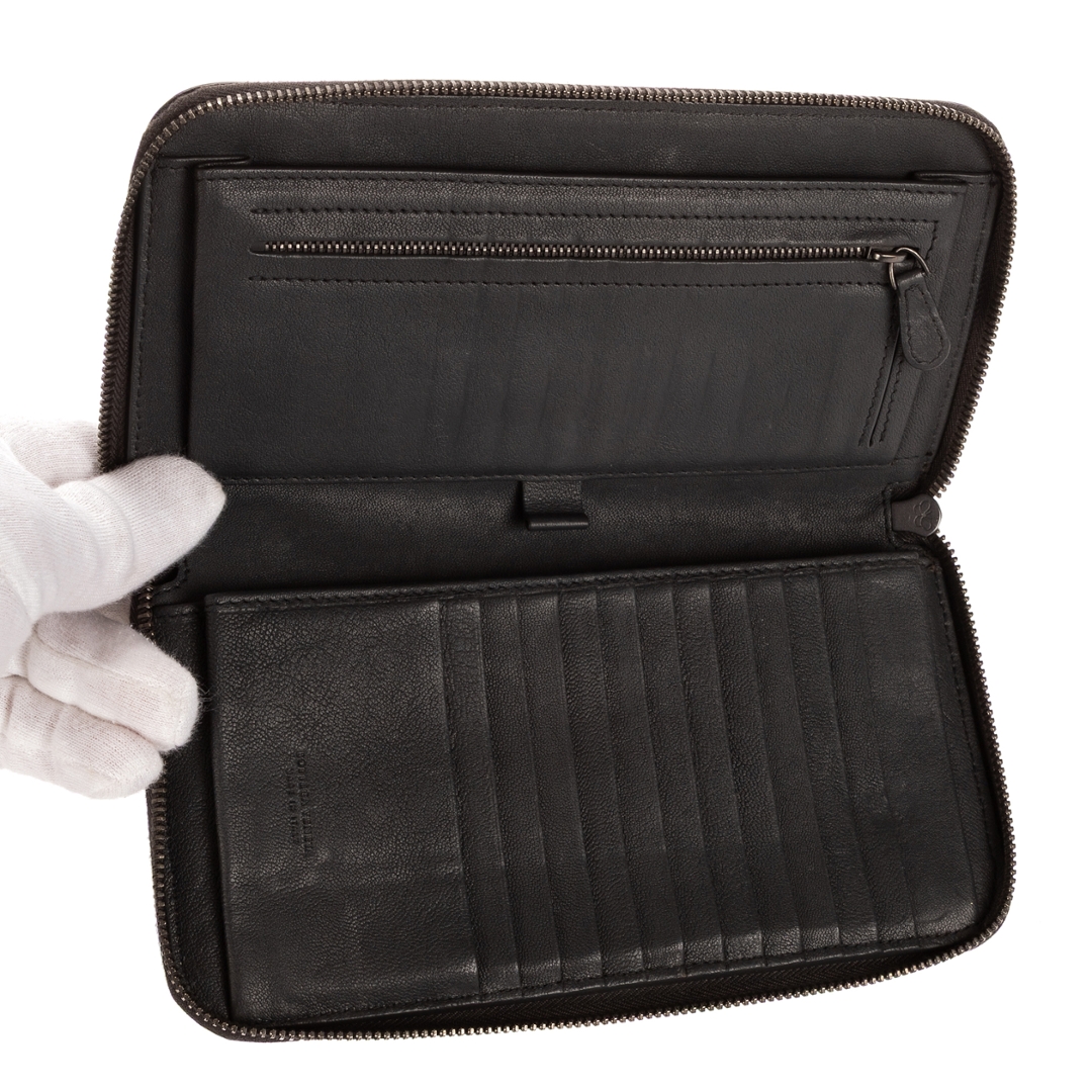 A vintage Bottega Veneta dark grey calf leather Intrecciato Zip Around Wallet with a certificate of authenticity, Approximately 11cm height, 21cm width.