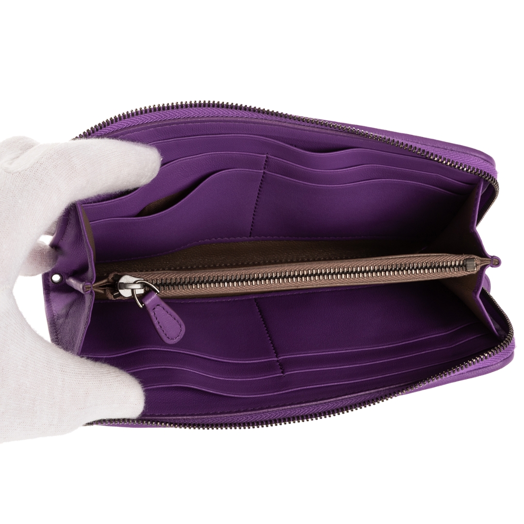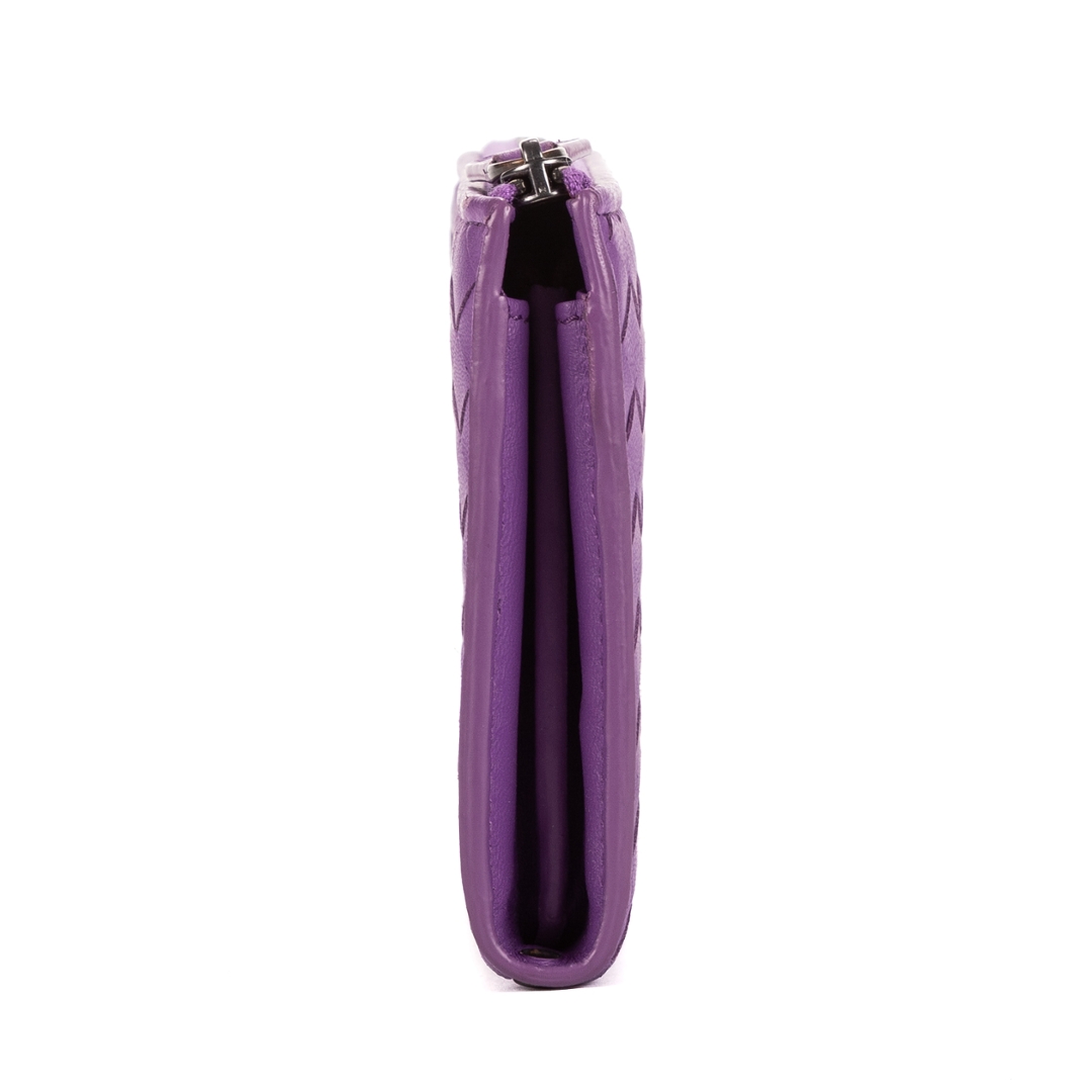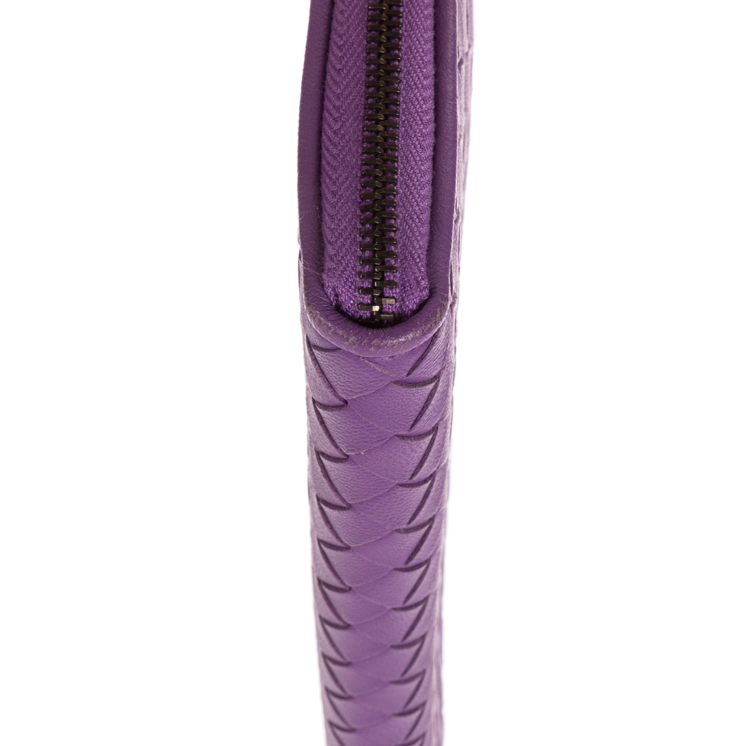A vintage Bottega Veneta purple calf leather Intrecciato Zip Wallet with a certificate of authenticity, Approximately 10cm height, 19cm width.
