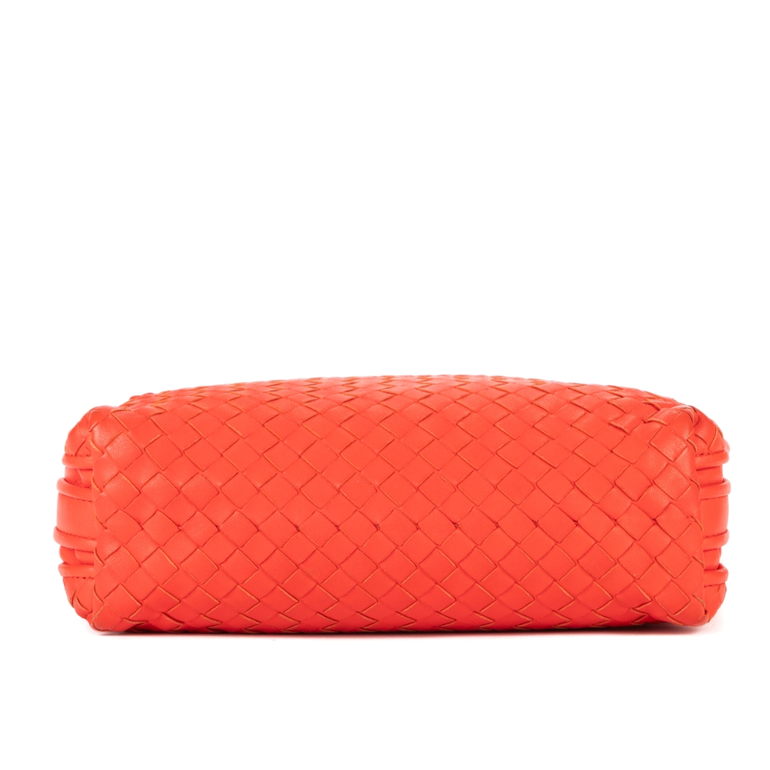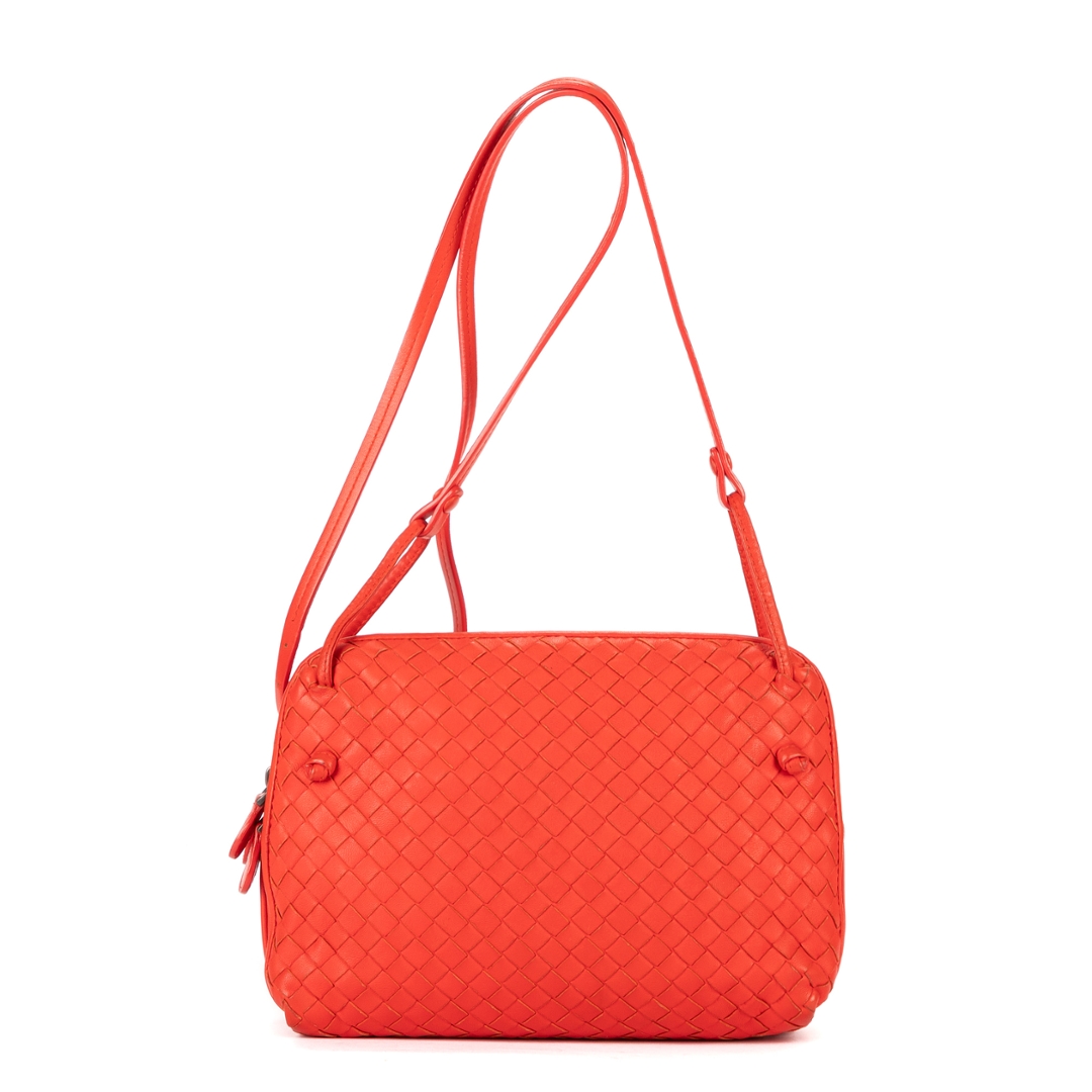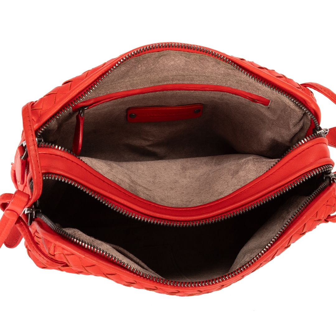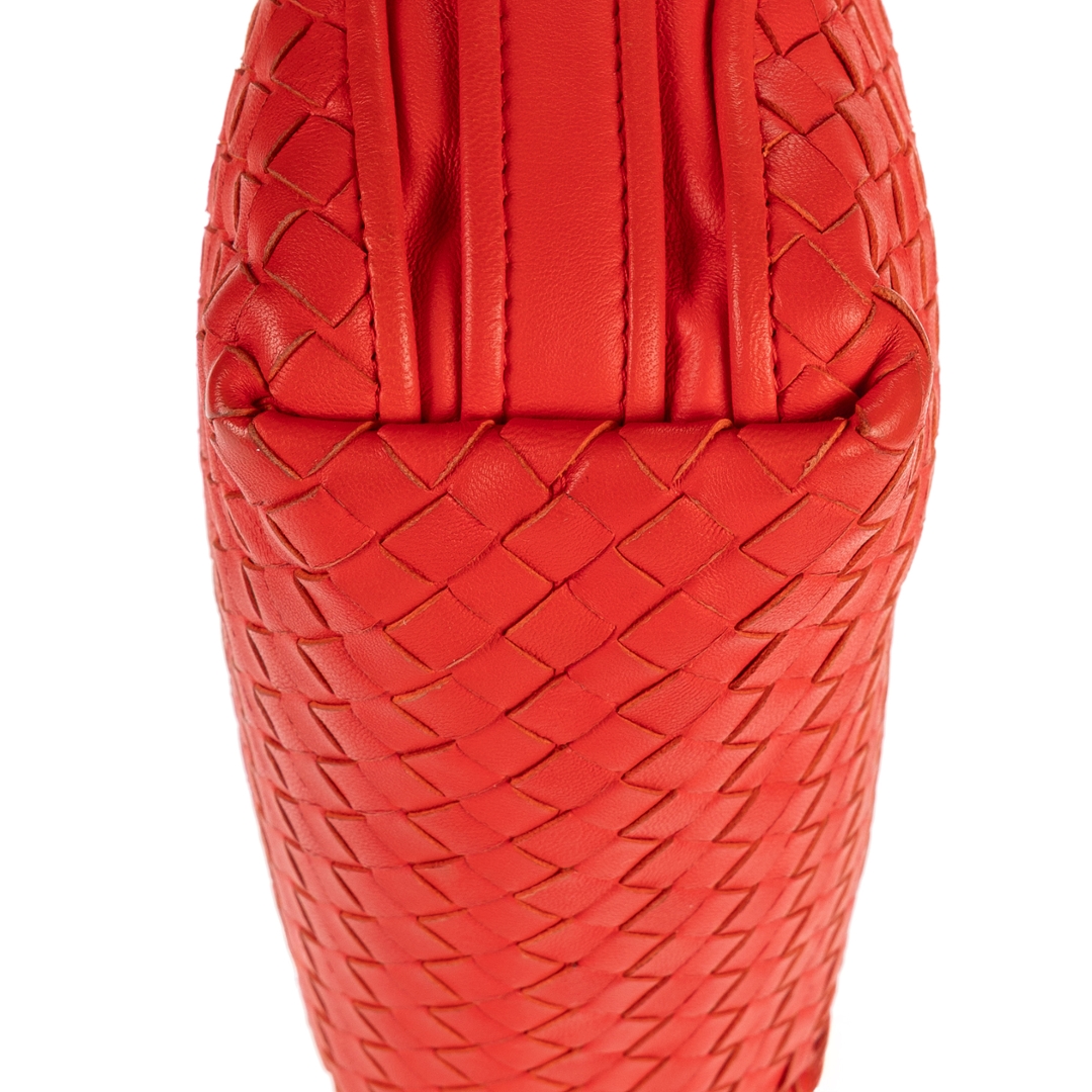 A vintage Bottega Veneta red calf leather Nodini Double Zipper bag with a certificate of authenticity, Approximately 19cm height, 22cm width.