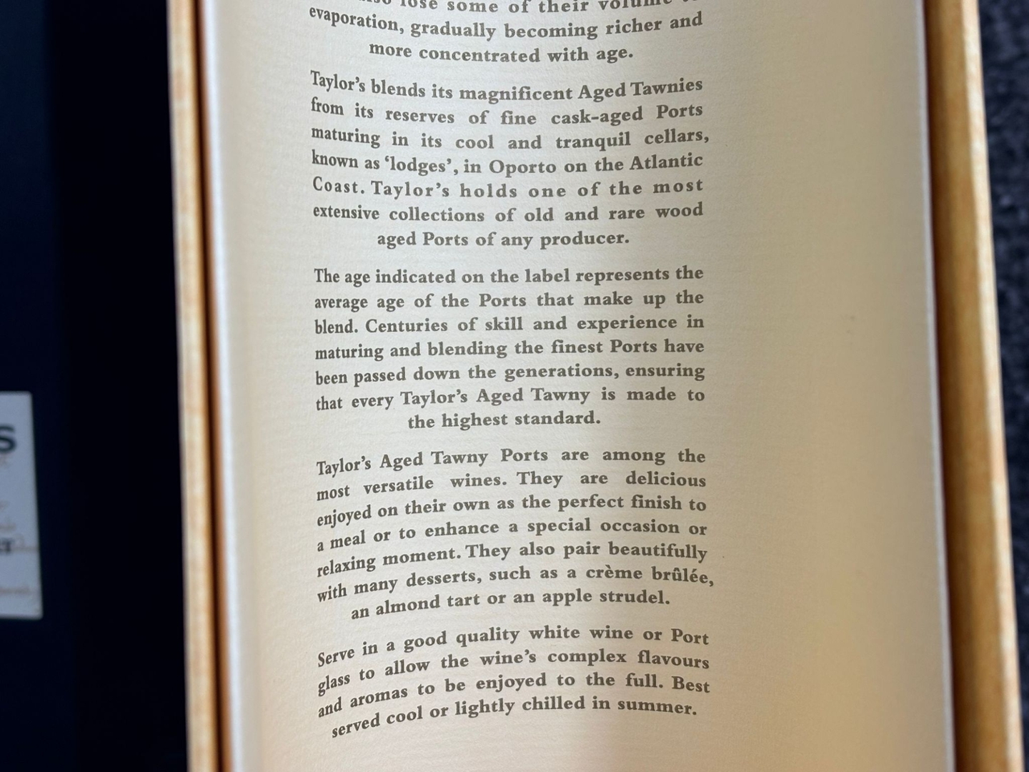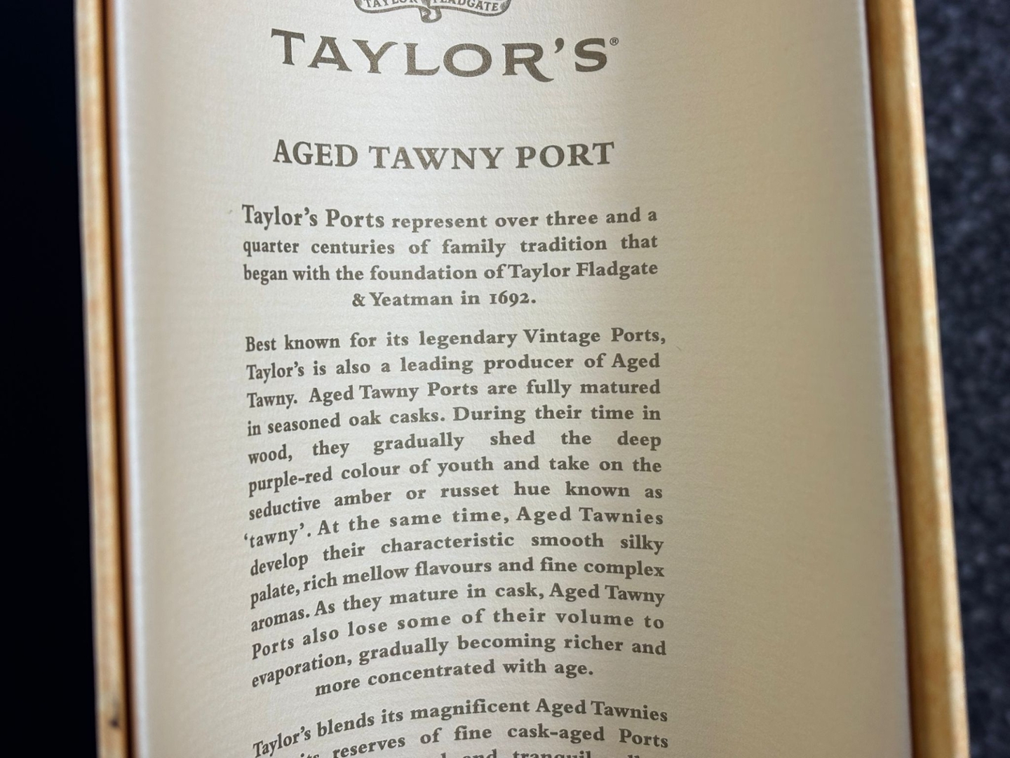 The aroma reveals layers of dried fruit, almonds, caramel, and subtle notes of honey and spice. On the palate, it unfolds with a velvety smooth texture, showcasing flavours of figs, hazelnuts, and hints of toffee that linger beautifully on the finish. Presented in its original Taylor’s gift box, this 75cl bottle makes a wonderful addition to any connoisseur’s collection or an impressive gift for special occasions. A true testament to Taylor’s centuries-old mastery since 1692.