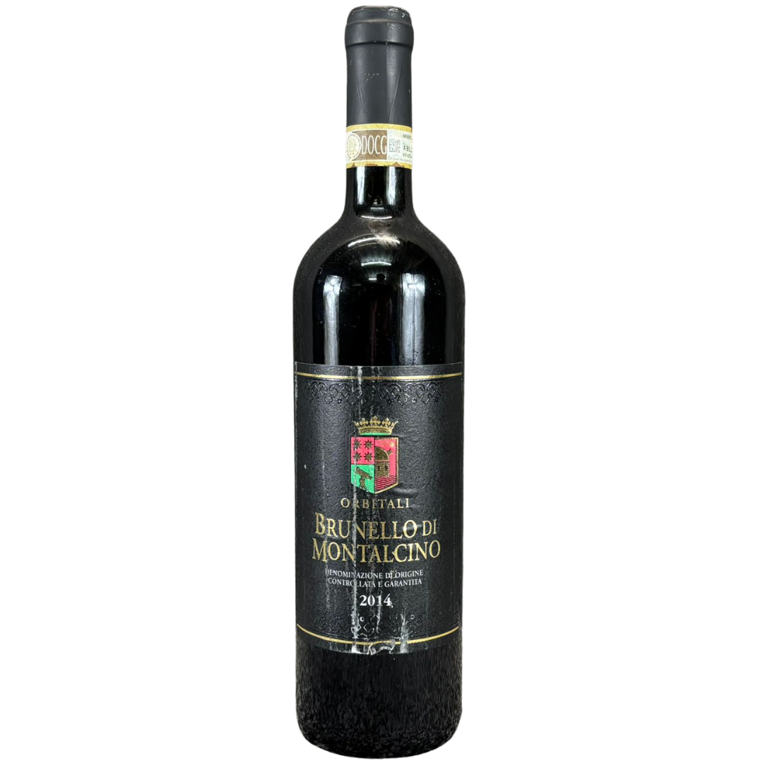 A 2014 bottle of Brunello di Montalcino Wine, shown exactly as in the image with its classic tall bottle, black capsule and elegant black-and-gold label featuring the traditional crest. The DOCG strip at the neck, the vintage year and the overall presentation match perfectly, confirming this as an authentic Brunello from one of Italy’s most prestigious appellations. The label shows some light wear, purely cosmetic and with no impact on the wine itself.