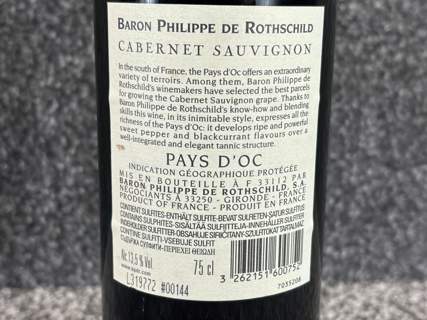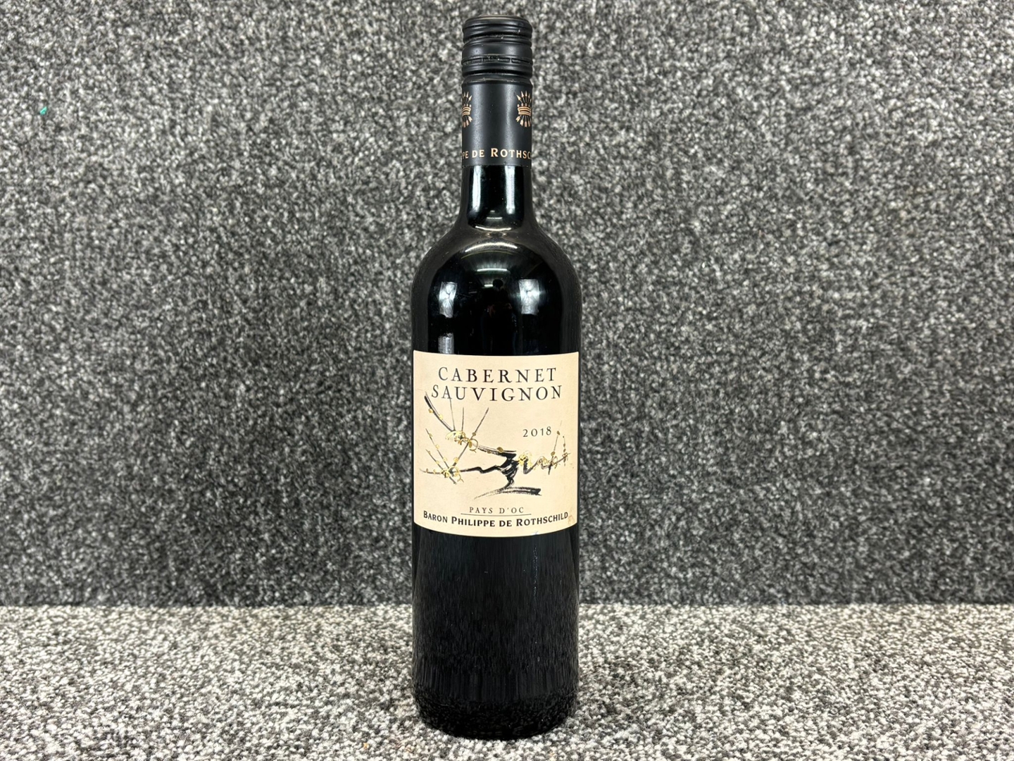 A 2018 bottle of Cabernet Sauvignon, 75cl, crafted under the esteemed Baron Philippe de Rothschild label. This French red from the Pays d’Oc region promises a smooth, characterful pour with the classic depth Cabernet lovers expect. The label highlights vine artwork and Rothschild detailing, adding a touch of prestige to its presentation.