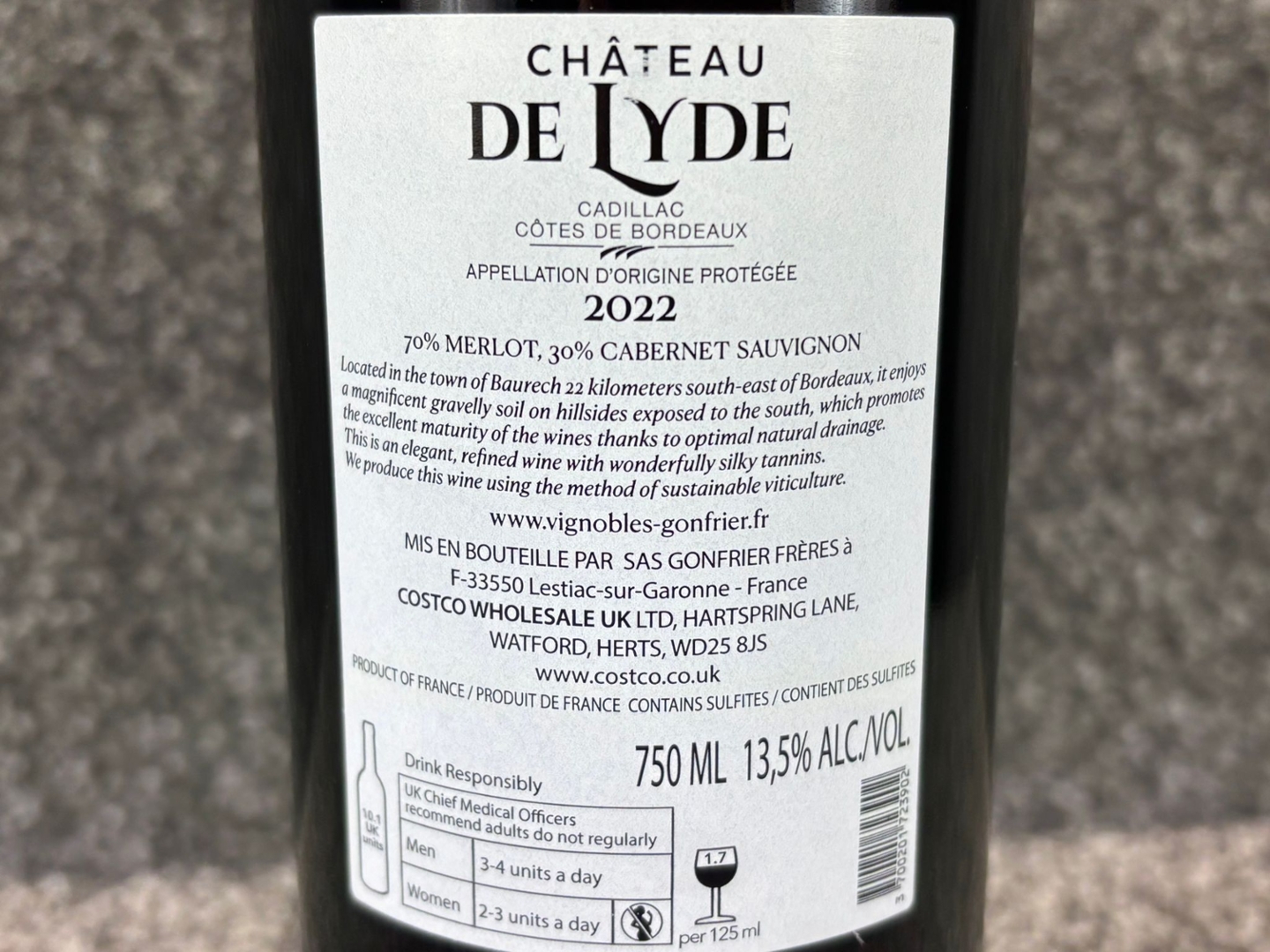 A bottle of 2022 Chateau de Lyde Cadillac Cotes De Bordeaux Wine. 750ml.