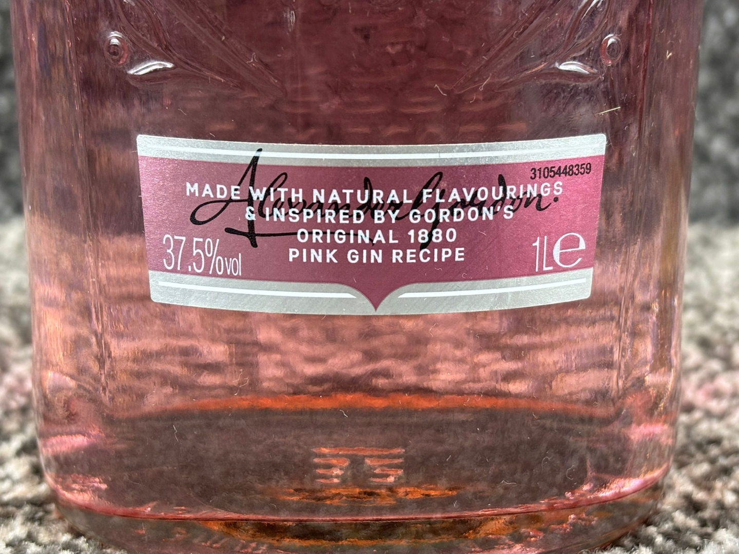 A bottle of Gordon's Premium Pink Distilled Gin. 1 litre.