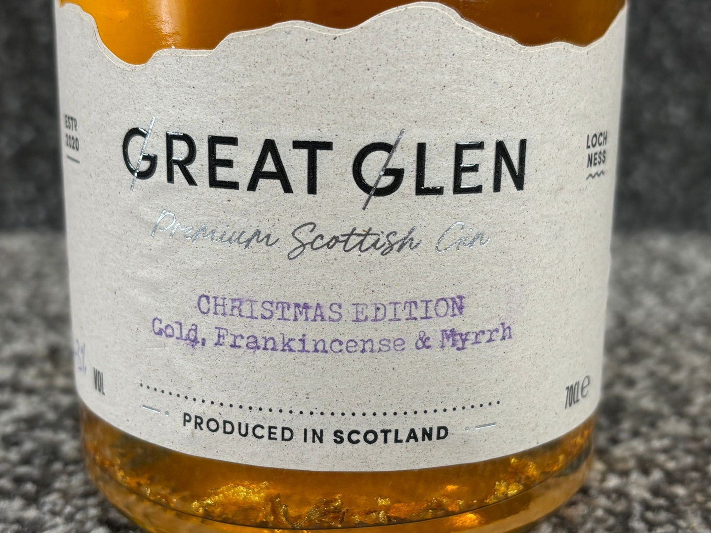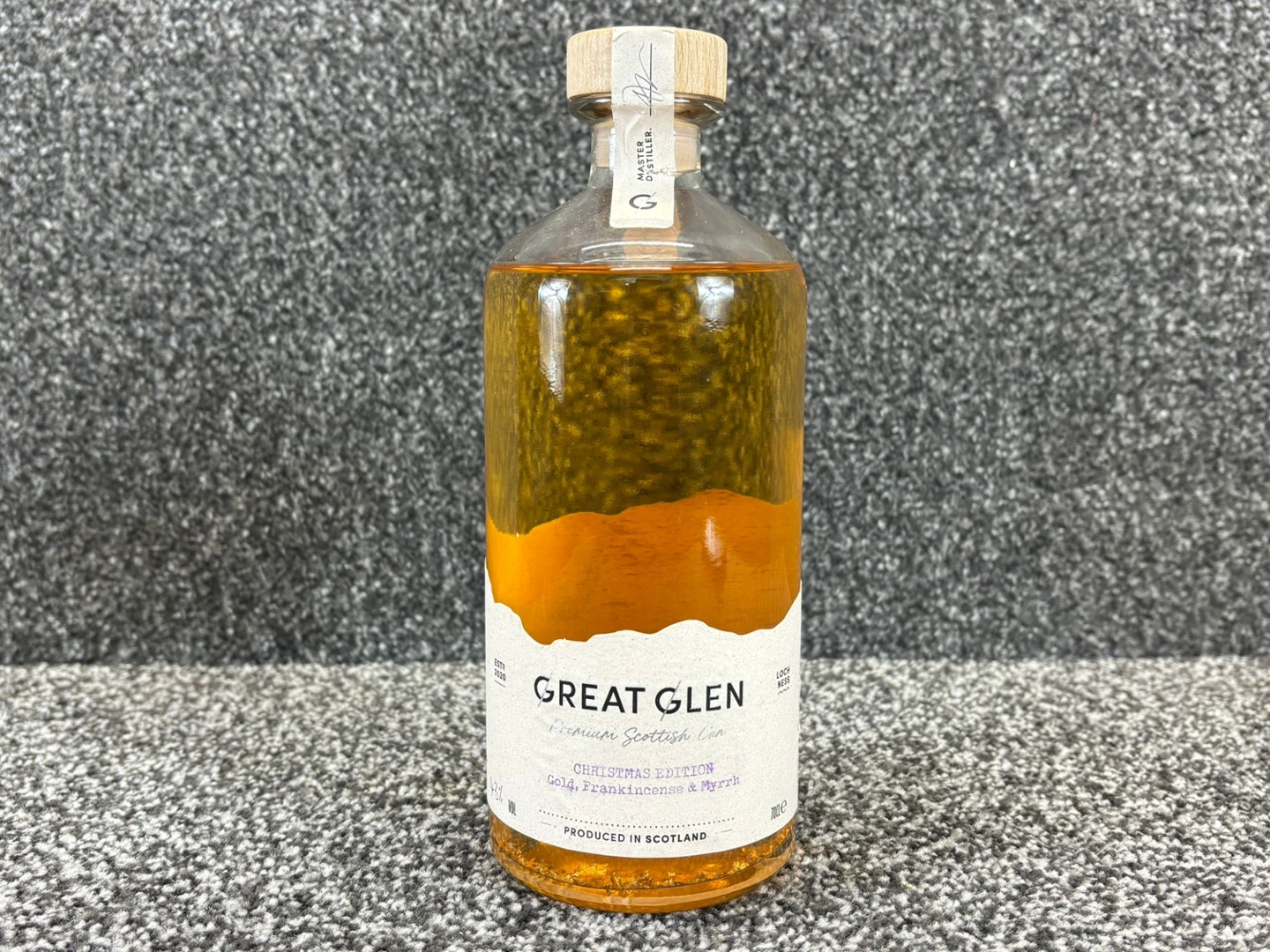 A 70cl bottle of Great Glen Premium Scottish Gin, shown exactly as pictured with its warm amber-gold hue and natural-style wooden stopper. The label clearly identifies this as the Christmas Edition, featuring festive botanicals such as frankincense and myrrh, which is consistent with the colour and presentation seen in the image.