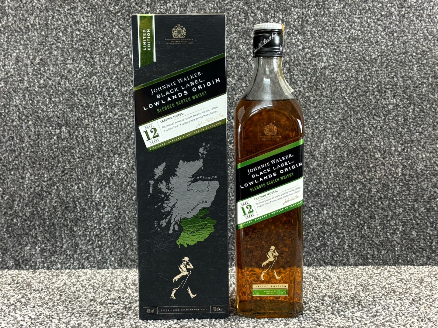 A bottle of Limited Edition Johnnie Walker Black Label Lowlands Origin Scotch Whisky in a presentation box. 700ml.
