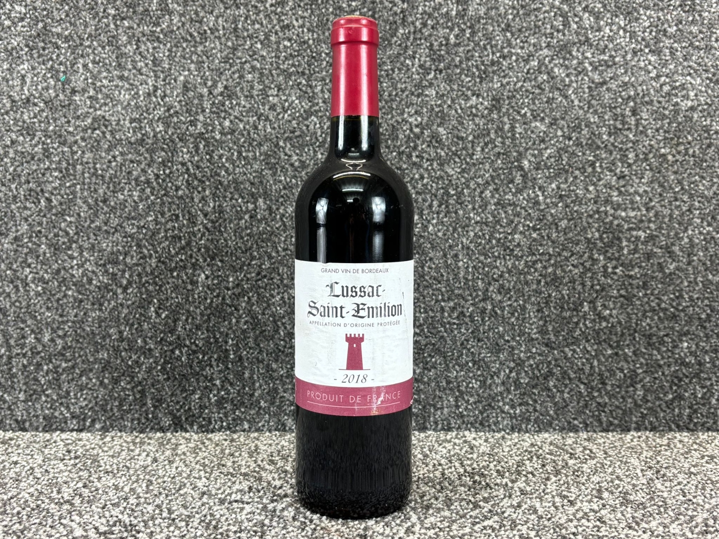 A 2018 bottle of Lussac Saint-Émilion Bordeaux Wine, shown exactly as in the image with its deep red capsule, classic Bordeaux bottle shape and clean, traditional label. The vintage, appellation and tower emblem all match perfectly, confirming this as an authentic Lussac Saint-Émilion from the celebrated Right Bank region of Bordeaux. The label shows slight surface wear, which is purely cosmetic and does not affect the wine itself.