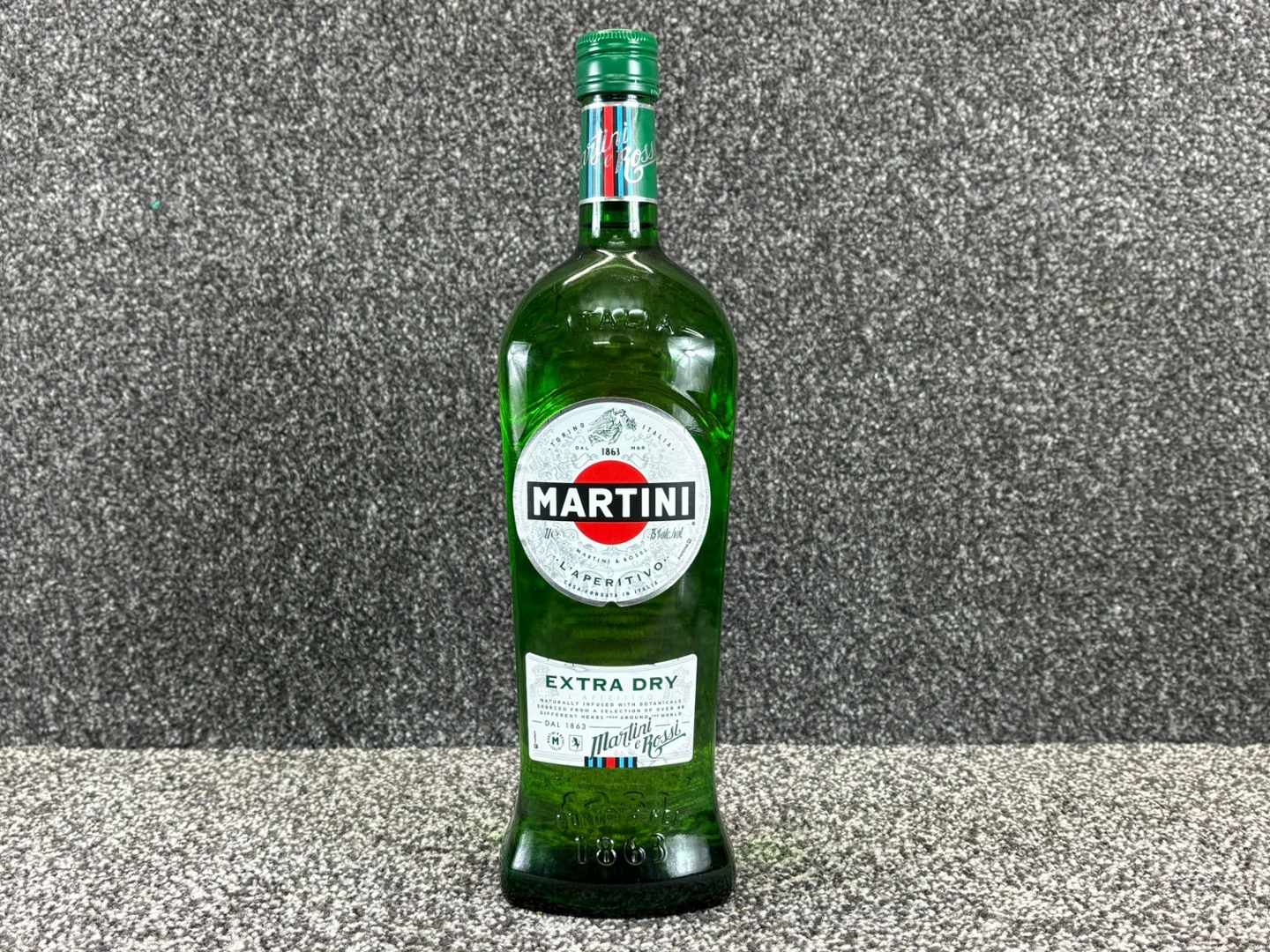 A 1-litre bottle of Martini Extra Dry, presented in its signature green glass with the classic Martini & Rossi branding exactly as shown in the image. This iconic Italian aperitif is celebrated for its crisp, aromatic character, offering a refined blend of citrus zest, delicate herbs and subtle floral notes that create its unmistakably dry, refreshing profile. The label and appearance in the image perfectly match the product described, including the distinctive embossed detailing on the glass and the Martini crest.
