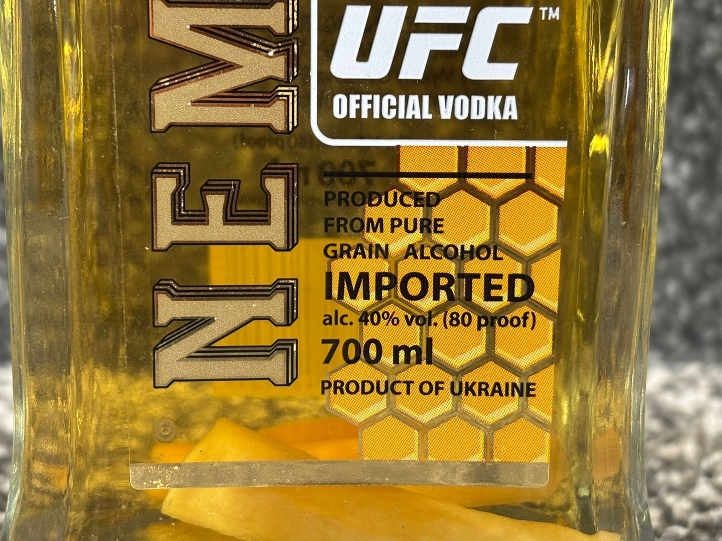 A 700ml bottle of Nemiroff Honey Pepper Ukrainian Flavoured Vodka brings together sweetness, spice and tradition in one striking presentation. The golden liquid reflects its unique infusion of natural honey and fiery red pepper, a combination deeply rooted in Ukrainian distilling heritage. The bold label design and hexagonal honeycomb pattern highlight its character, while the UFC Official Vodka branding adds a modern, energetic touch.
