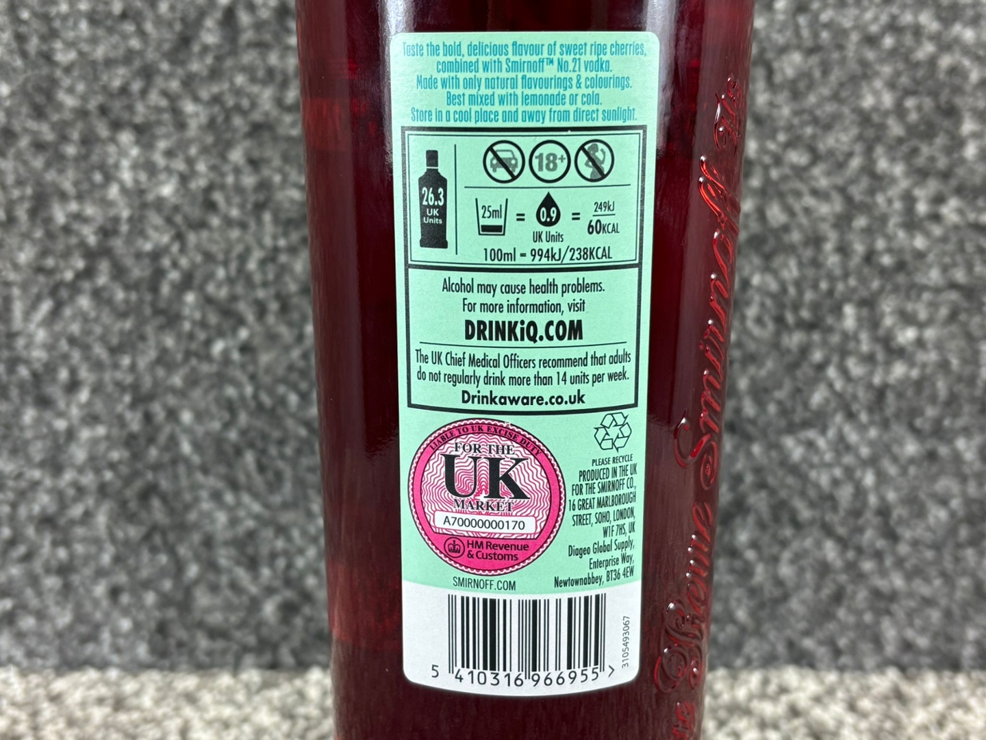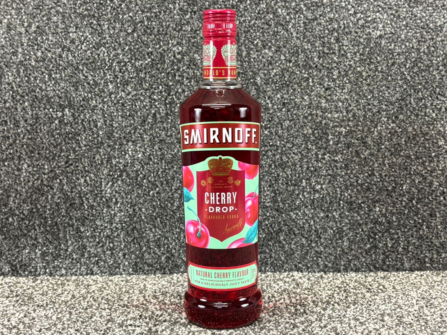 A 700ml bottle of Smirnoff Cherry Drop Vodka offers vibrant