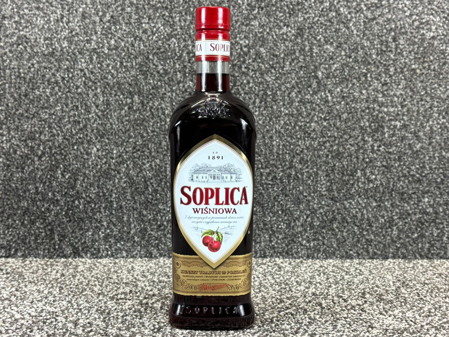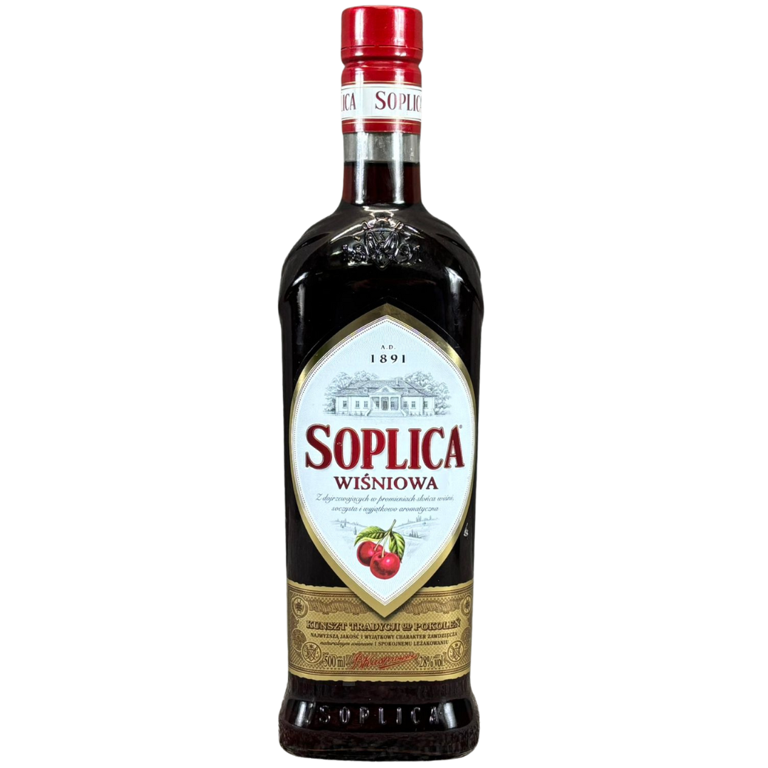 A 500ml bottle of Soplica Wiśniowa Cherry Vodka Liqueur offers a rich, traditional presentation with its deep red hue and classic Soplica branding. The embossed glass, elegant crest, and signature manor-house illustration highlight the brand’s long-standing Polish heritage, while the cherry imagery hints at the vibrant flavour inside. It’s a timeless, recognisable bottle that appeals to both collectors and fans of fruit liqueurs.