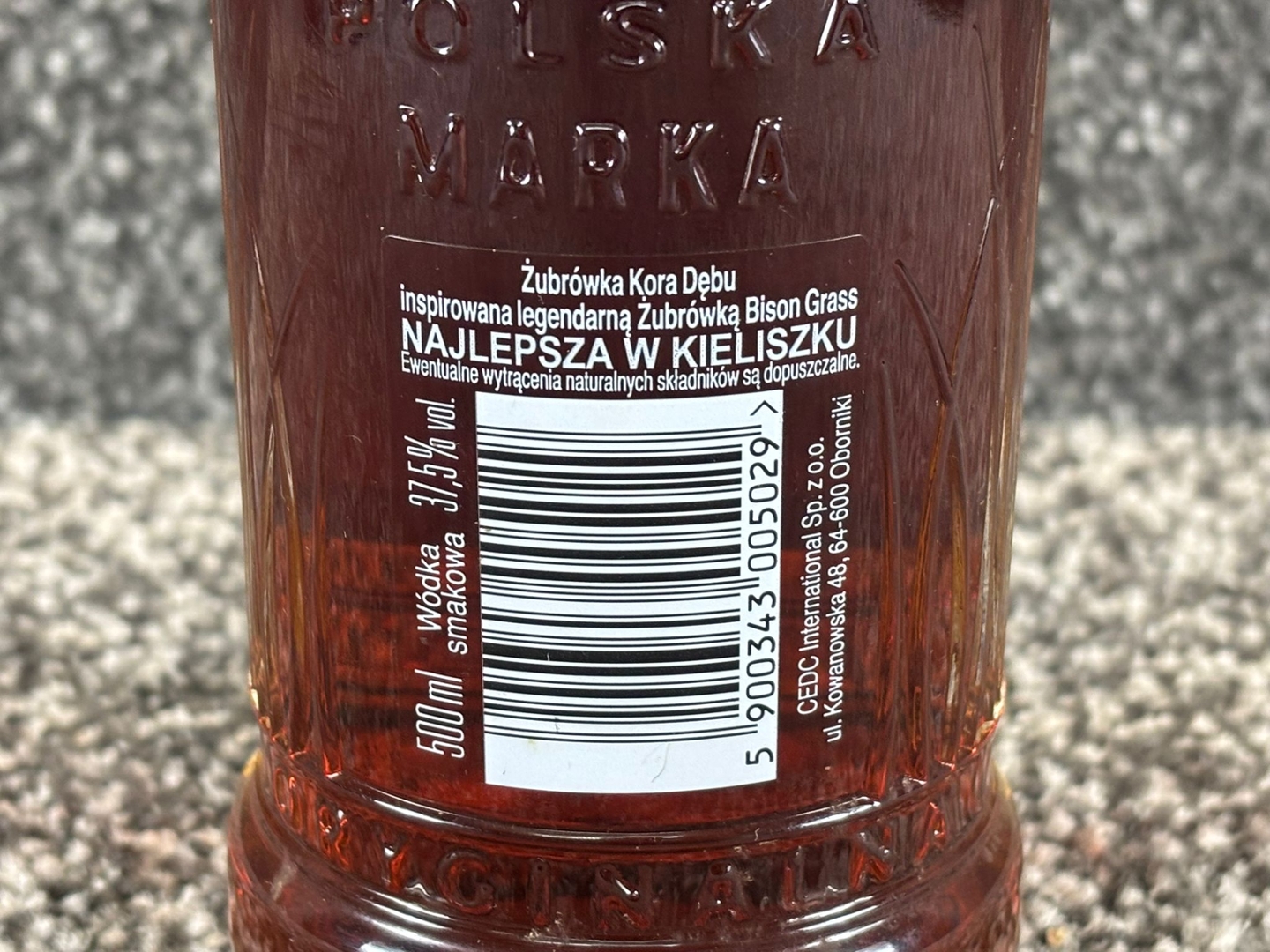 - > Bottle of Zubrowka Kora Debu Vodka.