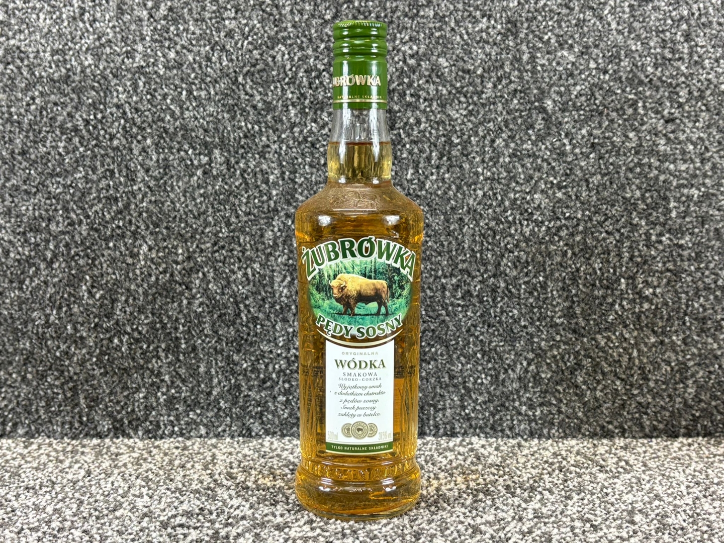 A bottle of Zubrowka Pedy Sosny Vodka. 500ml.