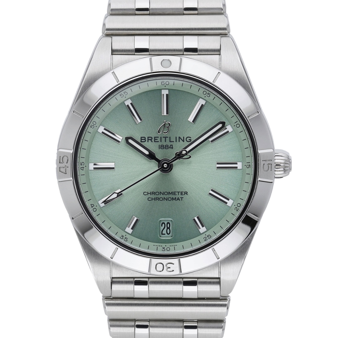 The 36mm stainless steel case is paired with Breitling’s signature rider-tab bezel, offering both visual distinction and practical functionality. The striking green dial features applied baton hour markers and luminous hands for excellent legibility, while the date aperture is positioned neatly at 6 o’clock for a balanced display. The dial is also marked “Chronometer”, confirming the watch’s COSC-certified automatic movement, ensuring exceptional accuracy and reliability. Clean dial proportions and polished indices give the watch a refined yet sporty appearance.