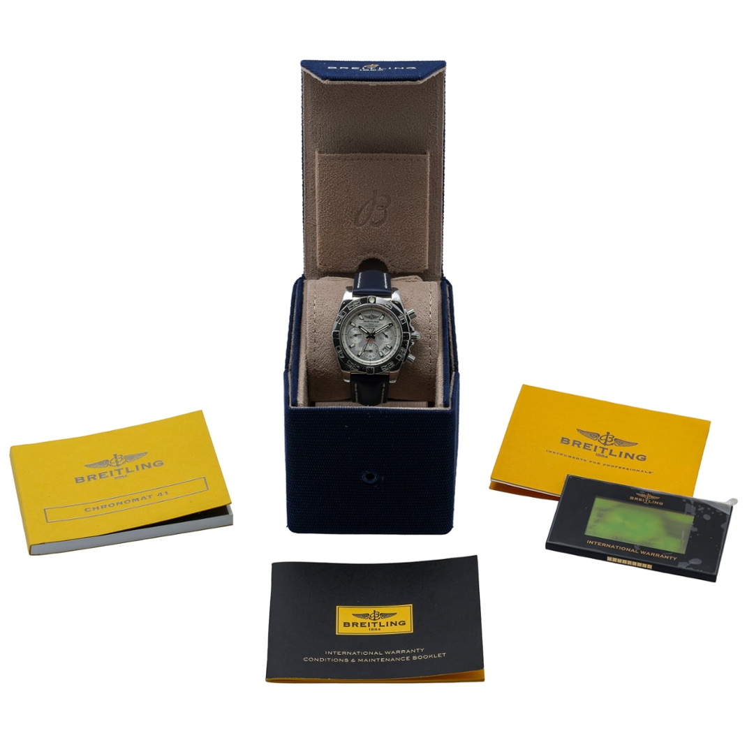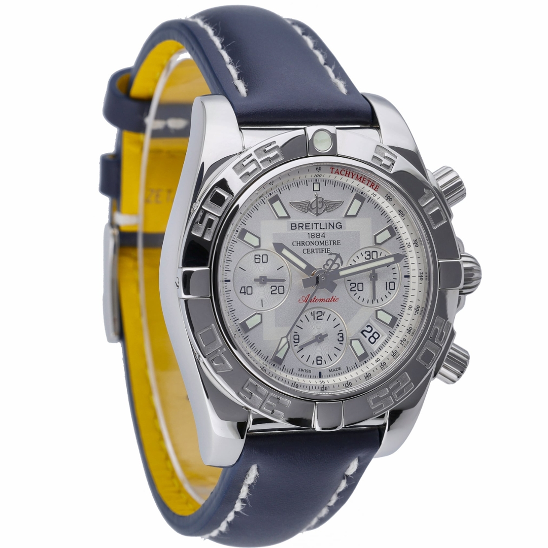 A Breitling Chronomat, model AB0140, presented in stainless steel with a blue leather strap, offering a bold and highly recognisable design rooted in the brand’s aviation heritage. The 41mm case is paired with the signature rider-tab bezel, giving the watch its distinctive and robust character. The crisp white dial is accented with applied hour markers, contrasting sub-dials, and a red chronograph seconds hand, delivering both clarity and visual impact, alongside a date display positioned between 4 and 5 o’clock.