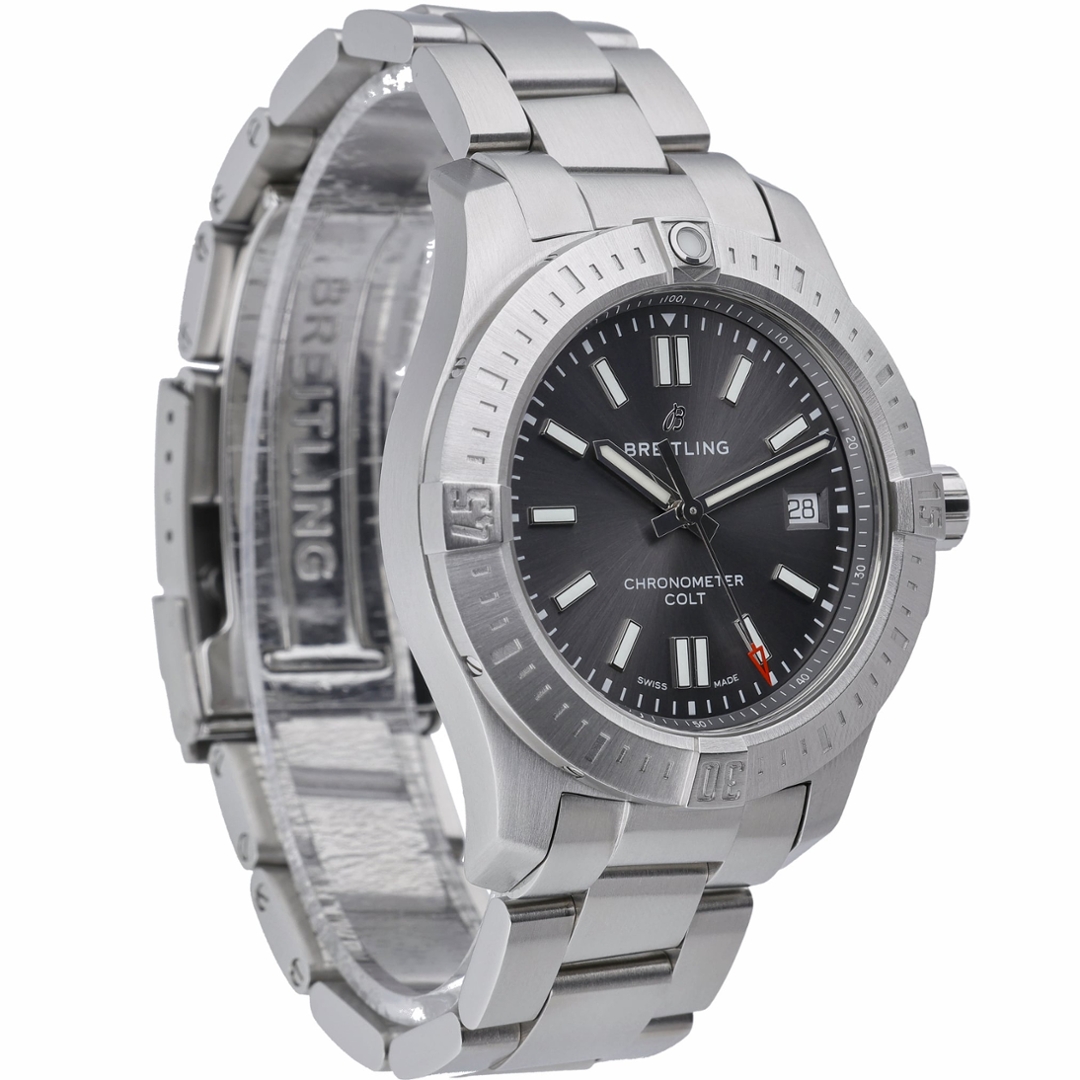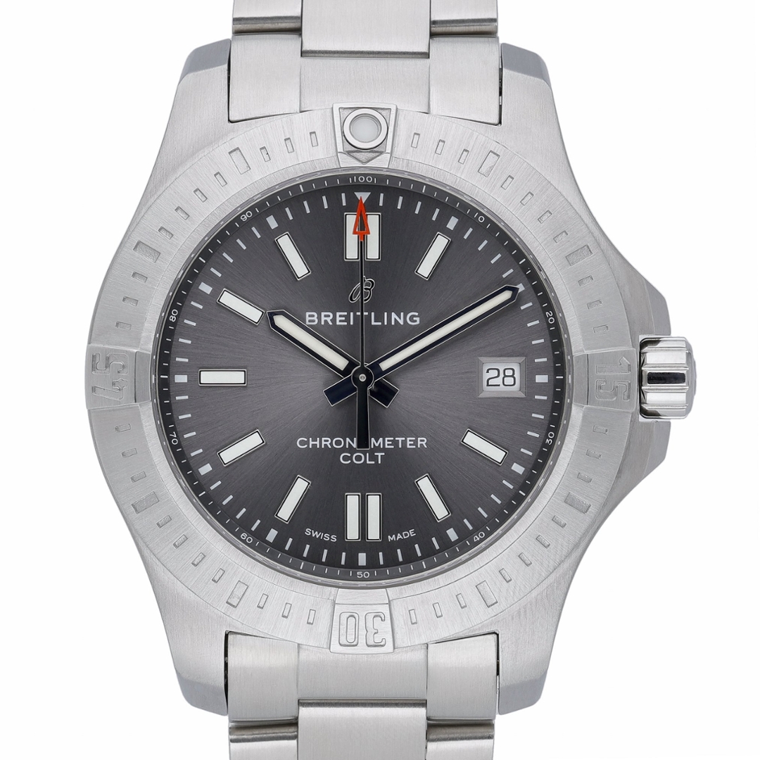 A Breitling Colt reference A17313, presented in stainless steel with a sleek grey sunburst dial, offering a clean, highly legible design. The 41mm case is defined by its robust construction and distinctive unidirectional bezel with rider tabs, delivering a strong, purposeful presence on the wrist. Bold applied hour markers and luminous hands ensure excellent visibility, while the red-tipped seconds hand adds a subtle yet striking contrast.