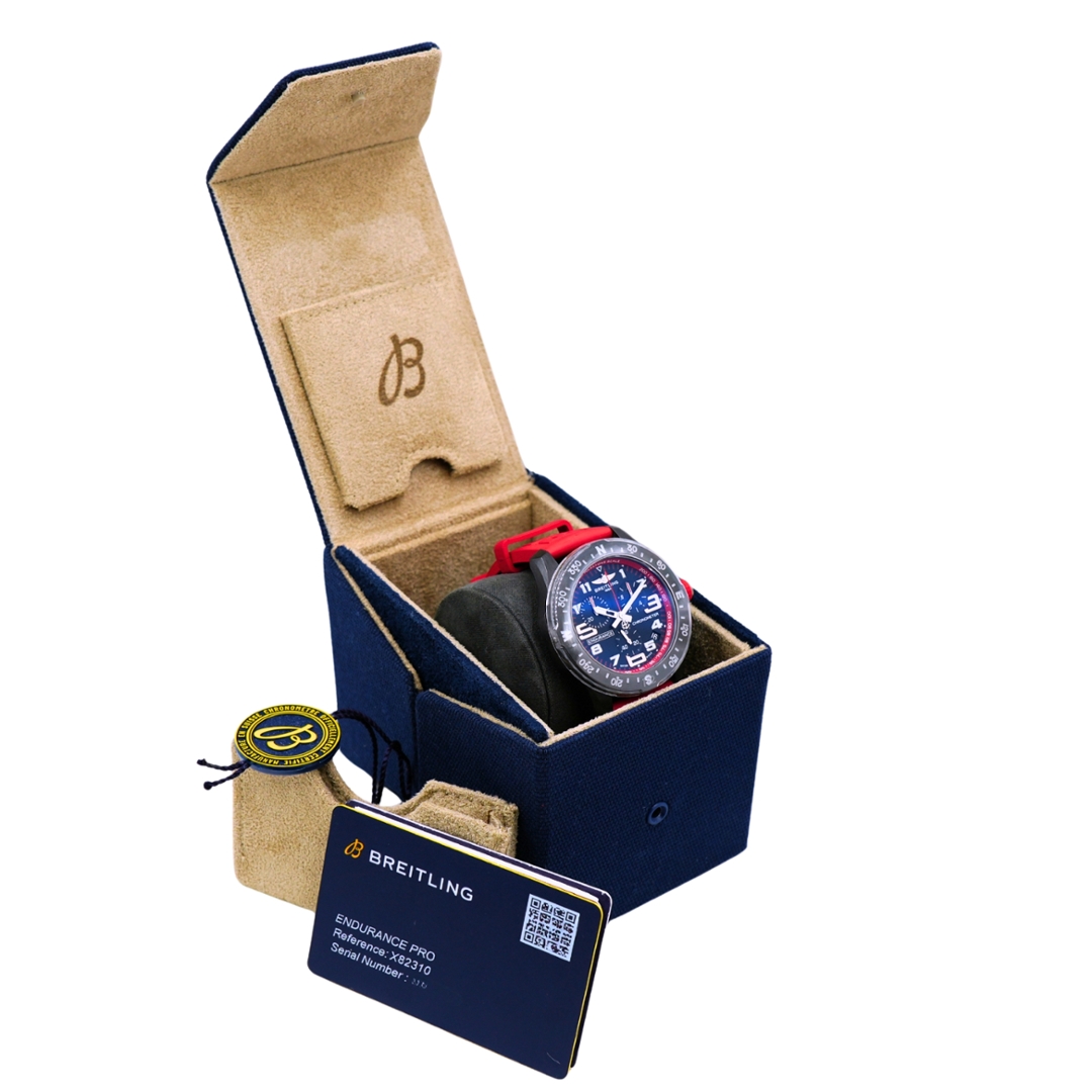 A Breitling Endurance Pro, reference X82310, is a modern, performance-led sports watch designed with durability and legibility at its core. Produced in 2023, the 44mm Breitlight carbon case is exceptionally lightweight and highly scratch-, corrosion-, and wear-resistant. Paired with a black dial, a matching bezel, and a vibrant red rubber strap.