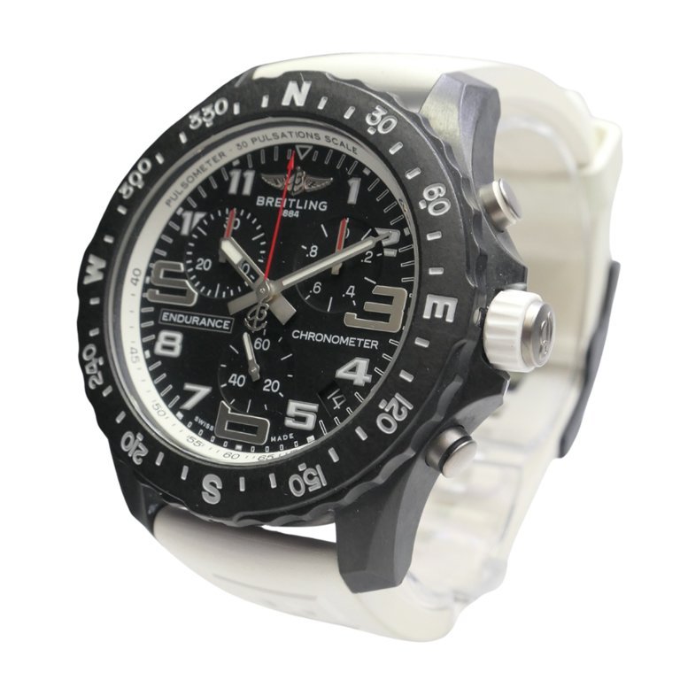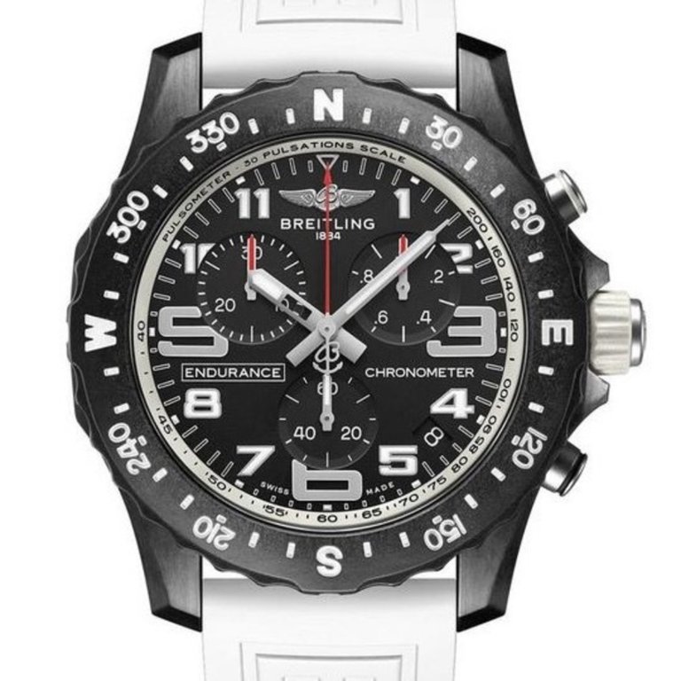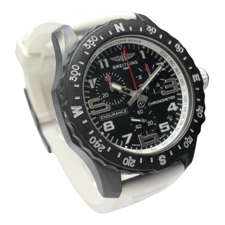 A Breitling Endurance Pro watch presented on a white rubber strap with a lightweight Breitlight case and matching clasp, paired with a striking black bezel and dial. Model number X82310, this 2021 example is designed for performance, precision, and endurance—embodying Breitling’s commitment to creating high-function sports watches for professionals and athletes alike. The 44mm case, made from Breitlight, is exceptionally robust, non-magnetic, and highly scratch-resistant, while being significantly lighter than titanium or steel.