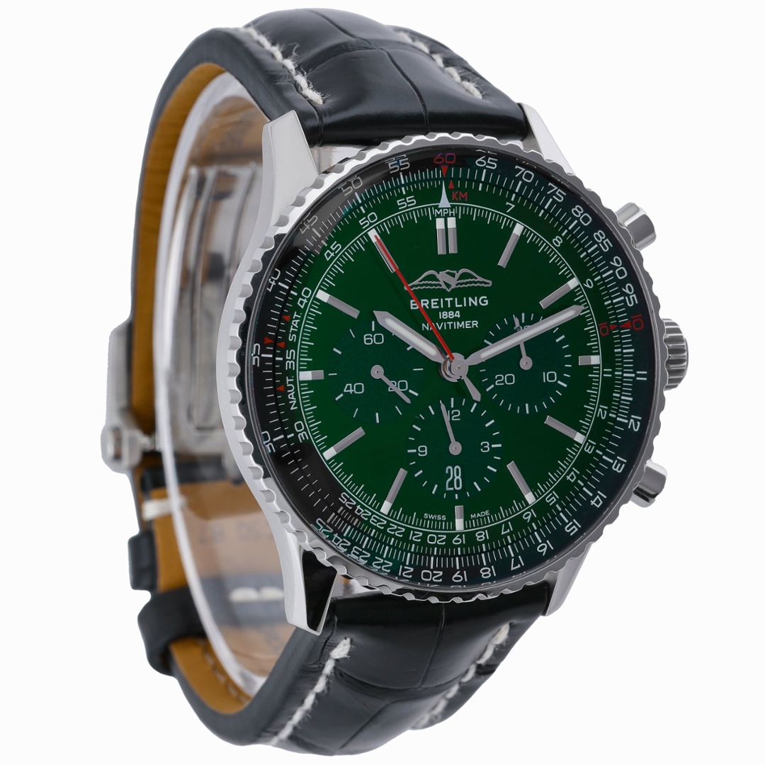 A Breitling Navitimer 1 B01 Chronograph 46, Black Leather Strap with a Stainless Steel Case & Clasp on a Green Dial