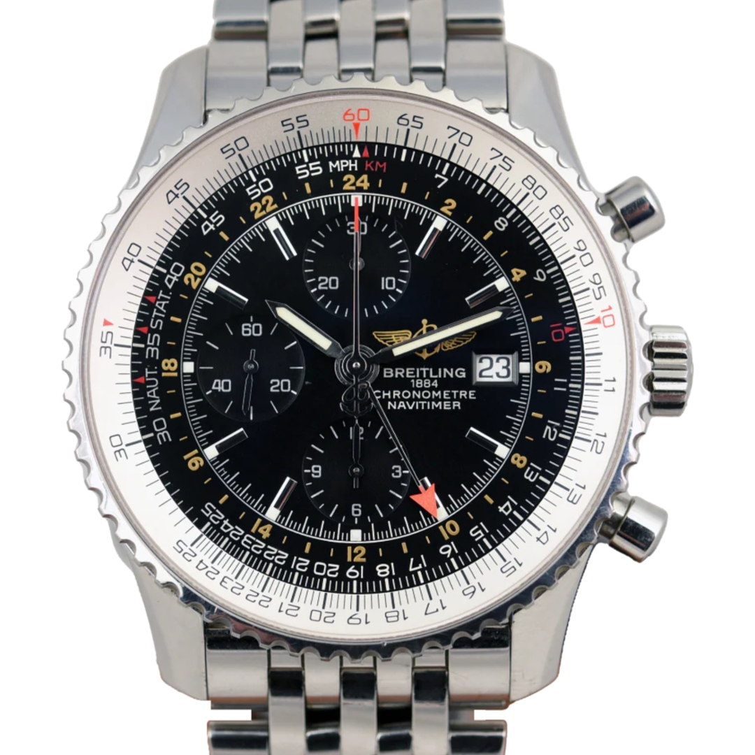 Breitling Navitimer Chronograph GMT 46 Watch, Stainless Steel on a Black Dial (Accompanied by the Original Leather Strap)