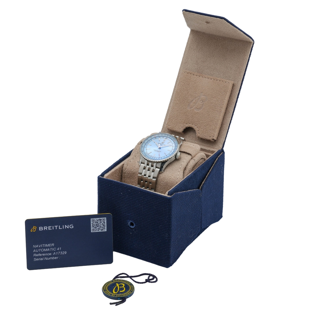 The 41mm stainless steel case frames a striking blue sunburst dial, delivering a refined yet technical appearance. Surrounding the dial is the Navitimer’s signature slide rule scale, allowing calculations such as fuel consumption, airspeed, and distance. Applied baton hour markers and luminous hands ensure strong legibility, while the dial is marked “Chronometer Navitimer,” confirming the presence of a COSC-certified automatic movement for exceptional precision and reliability. A discreet three-hand layout maintains a clean and balanced aesthetic.