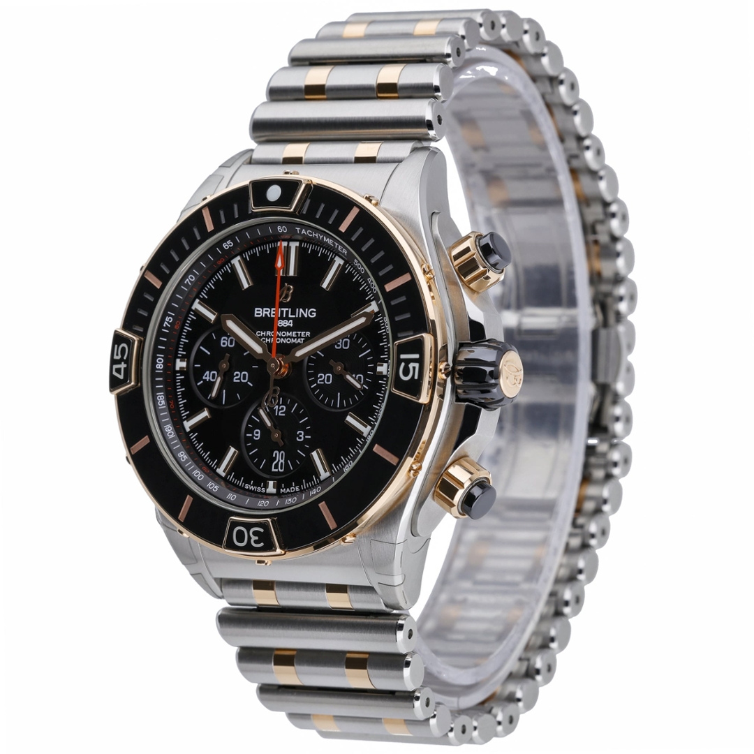 A Breitling Super Chronomat Watch, Stainless Steel & Rose Gold with a Black Bezel & Dial.