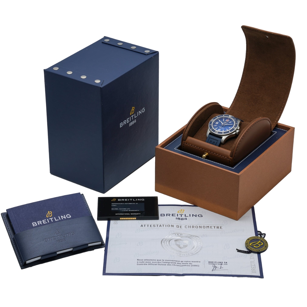 A Breitling Superocean 44 is a bold, competent professional dive watch designed for serious performance both in and out of the water. The substantial 44mm stainless steel case is paired with a striking blue unidirectional bezel and matching blue dial, delivering excellent legibility through oversized Arabic numerals, broad luminous hands, and a clearly defined minute scale. A discreet date window at three o’clock adds everyday practicality.