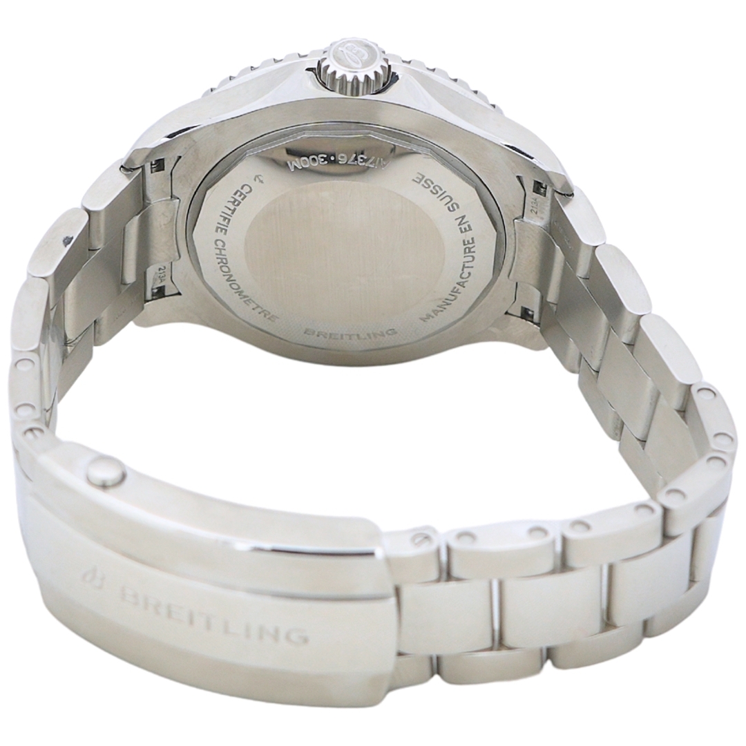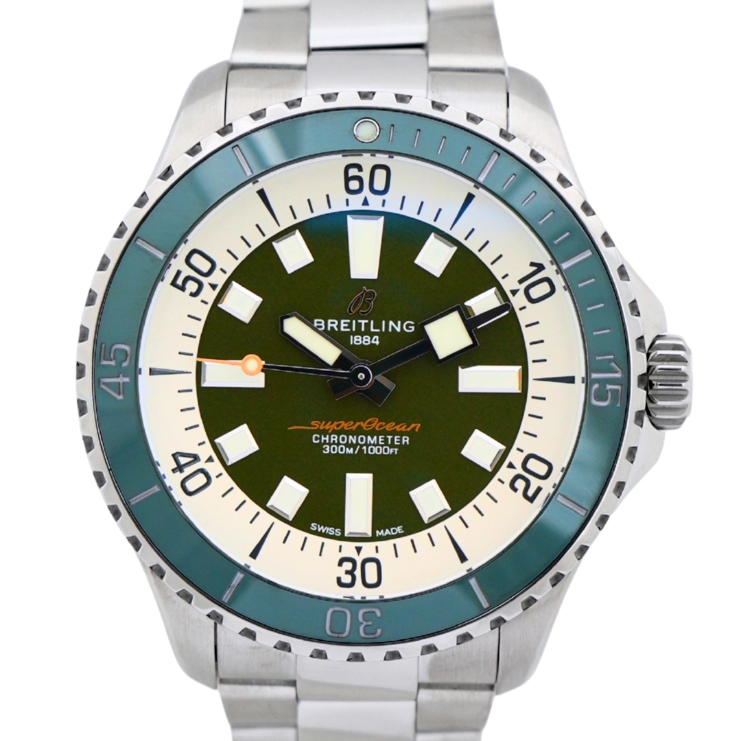 A Breitling Superocean 44 is a bold and contemporary take on a modern dive watch. This Breitling Superocean 44 reference A17376 stands out for its striking green-and-white dial paired with a matching green ceramic bezel. The 44mm stainless steel case delivers a strong wrist presence, while the highly legible dial features oversized luminous hour markers and broad hands for exceptional clarity. Designed for serious performance, it offers water resistance to 300 metres, combining professional capability with a vibrant, highly distinctive aesthetic that sets it apart from more traditional dive models.