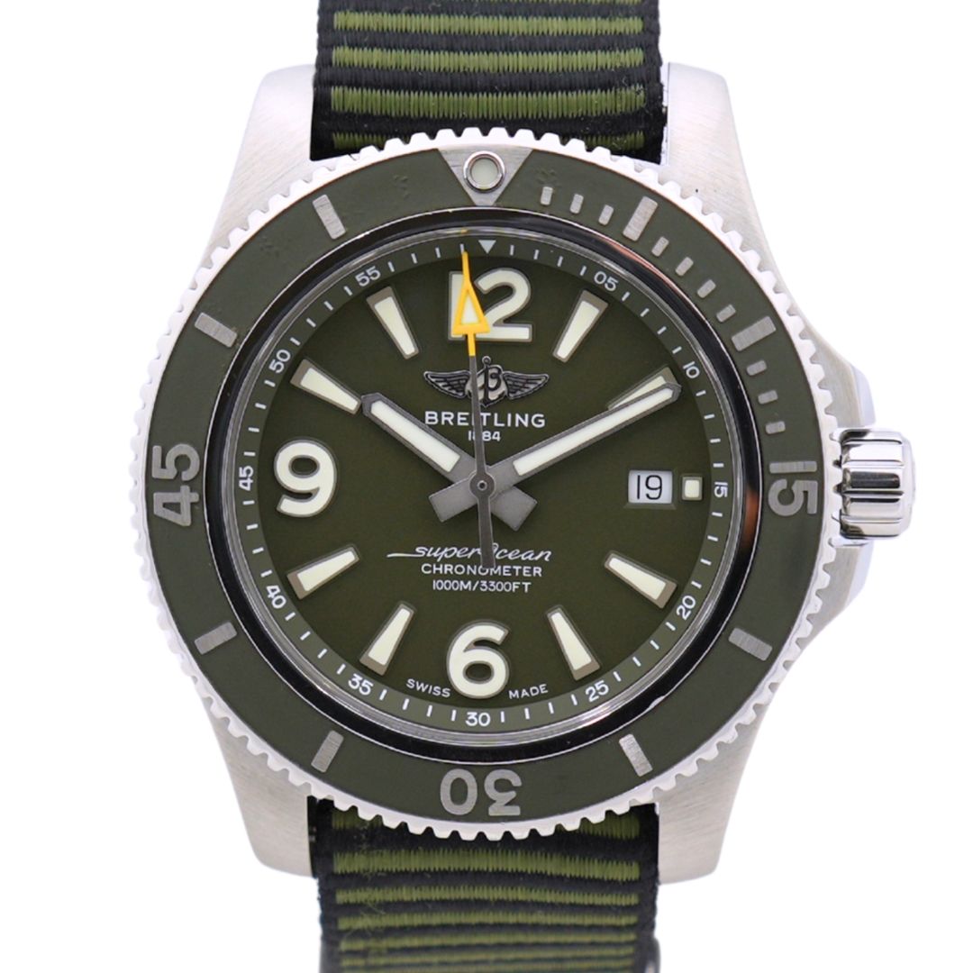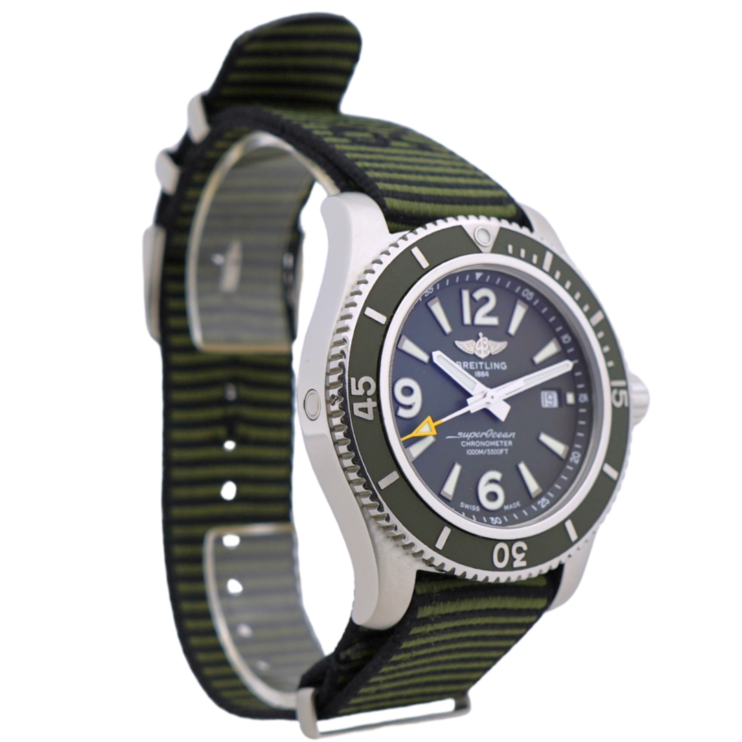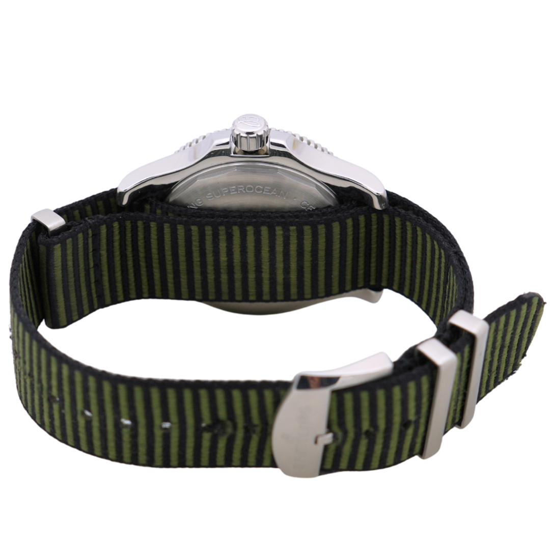 A Breitling Superocean II Automatic Watch, Fabric Khaki Green Strap with a Stainless Steel Case and Clasp on a Green Bezel and Dial