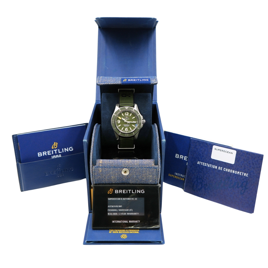 A Breitling Superocean II Automatic is a bold and purpose-driven dive watch (model A17367A11L1W1) that combines robust engineering with a distinctive, eco-conscious design. The 44mm stainless steel case is paired with a striking green dial and matching bezel, delivering a strong visual presence, while the khaki green fabric strap—developed in collaboration with Outerknown—adds both durability and a unique textured finish. Large Arabic numerals and luminous markers ensure excellent legibility in all conditions.