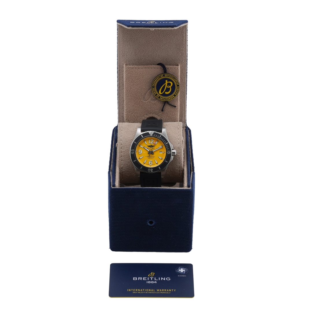 A Breitling Superocean 44 Watch, Black Rubber Strap with a Stainless Steel Case and Clasp and a Black Bezel & a Yellow Dial.