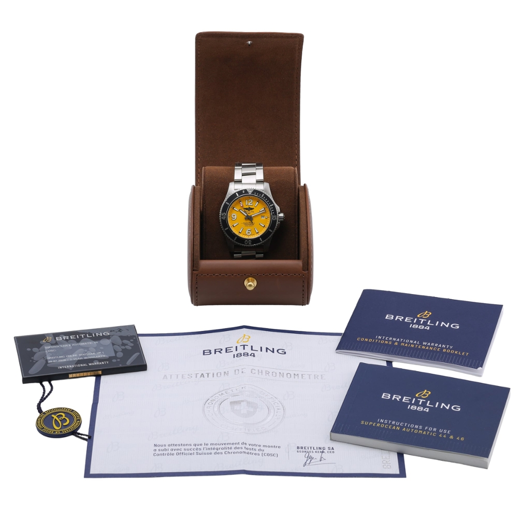 A Breitling Superocean 44 reference A17367 is presented in stainless steel with a black unidirectional bezel and a vibrant yellow dial, delivering bold, professional dive-watch aesthetics. The 44mm case is paired with a matching stainless steel bracelet and clasp, offering a strong yet wearable presence on the wrist. The dial features oversized luminous Arabic numerals at twelve, nine and six, applied baton hour markers, a date aperture at three o’clock, and the signature red-tipped seconds hand for clear underwater visibility.