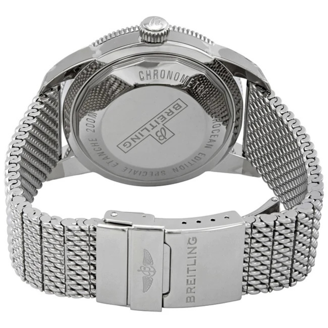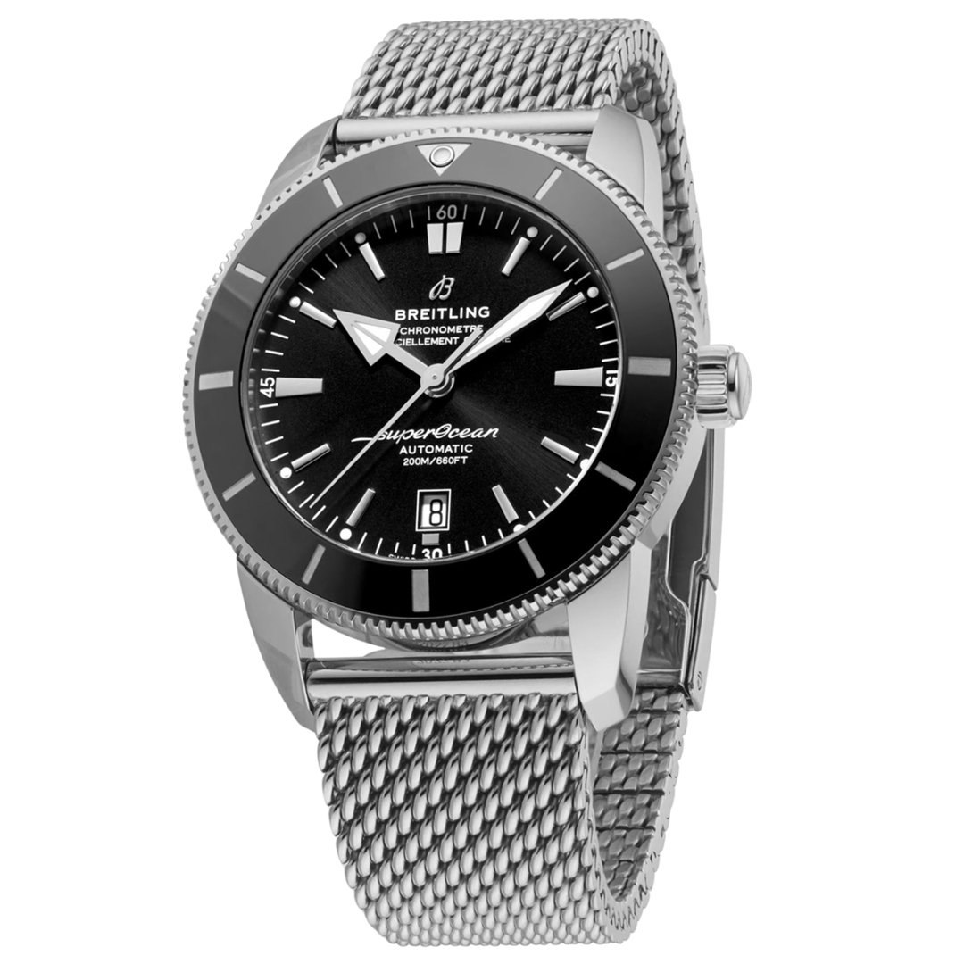A Breitling Superocean Heritage B20 Automatic 46 in stainless steel, featuring a black ceramic bezel and a matching black dial, presented in the box and certified with original Breitling paperwork. The 46mm case delivers commanding wrist presence, complemented by the stainless steel mesh bracelet that reinforces the model’s vintage-inspired dive heritage. Clean baton markers, an arrow hour hand, and a minimalist dial layout preserve the distinctive Superocean identity.
