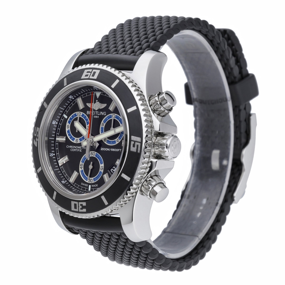 Completing the watch is a durable black rubber strap secured with a stainless steel clasp, designed to offer comfort and flexibility in demanding environments. Bold, highly capable, and engineered for serious underwater performance, the Breitling Superocean Chronograph stands as one of the brand’s most powerful professional dive watches.